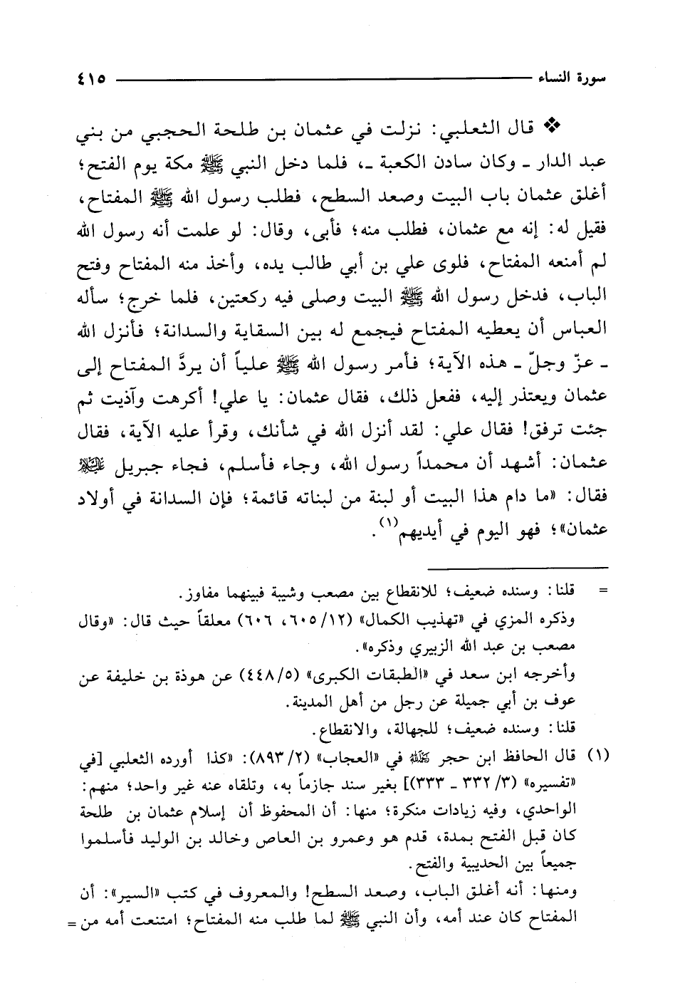 (¬1) قال الحافظ ابن حجر -رحمه الله- في "العجاب" (2/ 893): "كذا أورده الثعلبي [في "تفسيره" (3/ 332 - 333)] بغير سند جازماً به، وتلقاه عنه غير واحد؛ منهم: الواحدي، وفيه زيادات منكرة؛ منها: أن المحفوظ أن إسلام عثمان بن طلحة كان قبل الفتح بمدة، قدم هو وعمرو بن العاص وخالد بن الوليد فأسلموا جميعاً بين الحديبية والفتح.