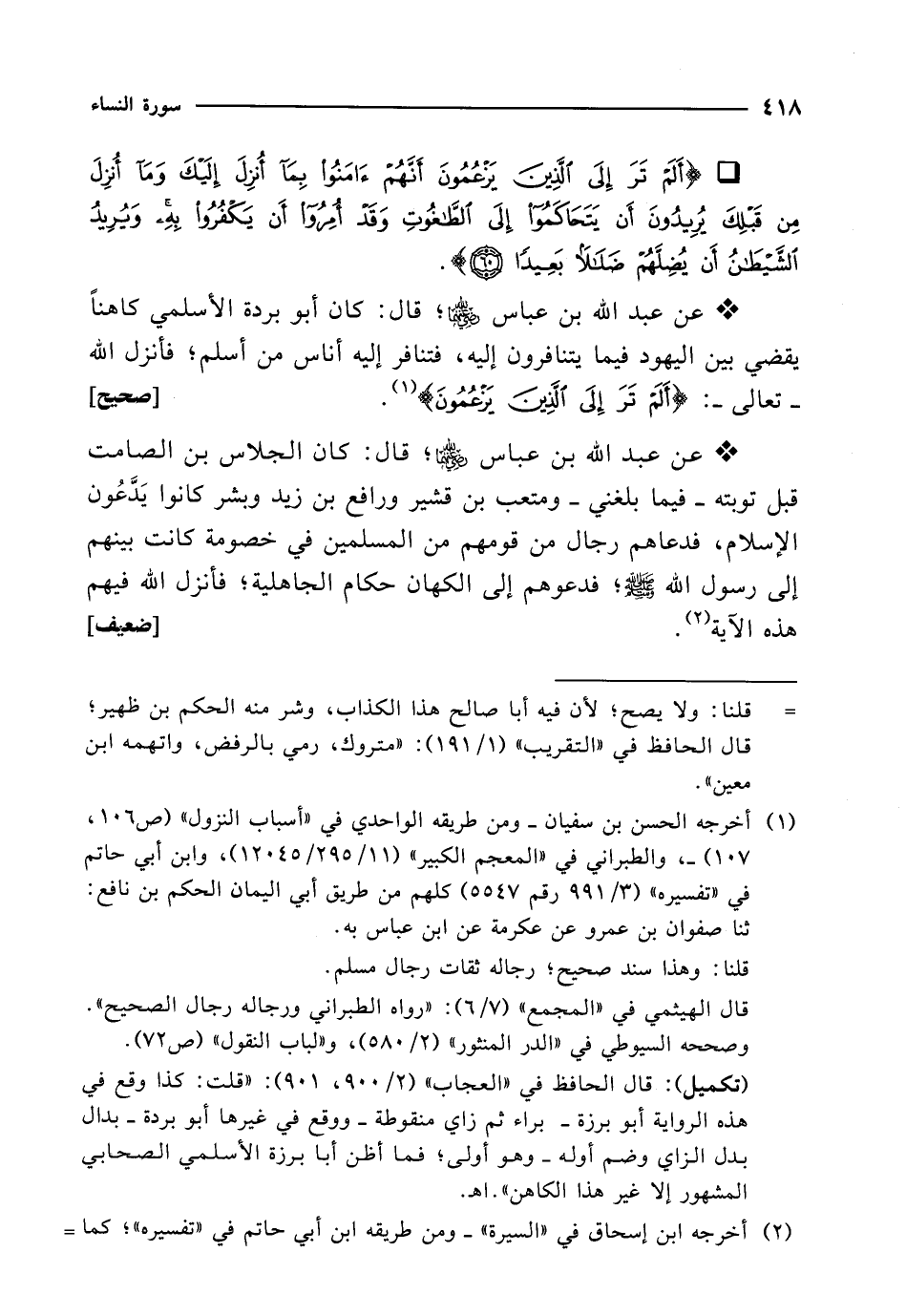 * عن عبد الله بن عباس -رضي الله عنهما-؛ قال: كان الجلاس بن الصامت قبل توبته -فيما بلغني- ومتعب بن قشير ورافع بن زيد وبشر كانوا يَدَّعُون الإِسلام، فدعاهم رجال من قومهم من المسلمين في خصومة كانت بينهم إلى رسول الله - صلى الله عليه وسلم -؛ فدعوهم إلى الكهان حكام الجاهلية؛ فأنزل الله فيهم هذه الآية (¬2). [ضعيف]