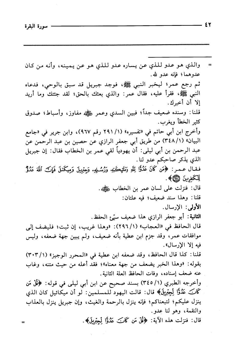 وأخرج ابن أبي حاتم في "تفسيره" (1/ 291 رقم 967)، وابن جرير في "جامع البيان" (1/ 348) من طريق أبي جعفر الرازي عن حصين بن عبد الرحمن عن عبد الرحمن بن أبي ليلى: أن يهودياً لقي عمر بن الخطاب فقال: إن جبريل الذي يذكر صاحبكم عدو لنا.