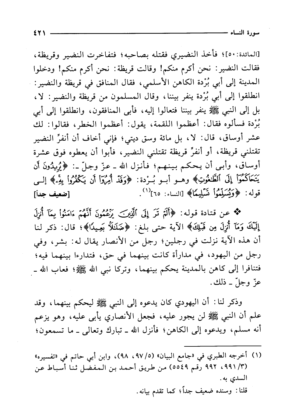 [المائدة: 50]؛ فأخذ النضيري فقتله بصاحبه؛ فتفاخرت النضير وقريظة، فقالت النضير: نحن أكرم منكم! وقالت قريظة: نحن أكرم منكم! ودخلوا المدينة إلى أبي بُرْدة الكاهن الأسلمي، فقال المنافق في قريظة والنضير: انطلقوا إلى أبي بُرْدة ينفر بيننا، وقال المسلمون من قريظة والنضير: لا، بل إلى النبي - صلى الله عليه وسلم - ينفر بيننا فتعالوا إليه، فأبى المنافقون، وانطلقوا إلى أبي بُرْدة فسألوه فقال: أعظموا اللقمة، يقول: أعظموا الخطر، فقالوا: لك عشر أوساق، قال لا، بل مائة وسق ديتي؛ فإني أخاف أن أنفرِّ النضير تقتلني قريظة، أو أنفرِّ قريظة تقتلني النضير، فأبوا أن يعطوه فوق عشرة أوساق، وأبى أن يحكم بينهم؛ فأنزل الله -عزّ وجلّ-: {يُرِيدُونَ أَنْ يَتَحَاكَمُوا إِلَى الطَّاغُوتِ} وهو أبو بُرْدة: {وَقَدْ أُمِرُوا أَنْ يَكْفُرُوا بِهِ} إلى قوله: {وَيُسَلِّمُوا تَسْلِيمًا} [النساء: 65] (¬1). [ضعيف جداً]