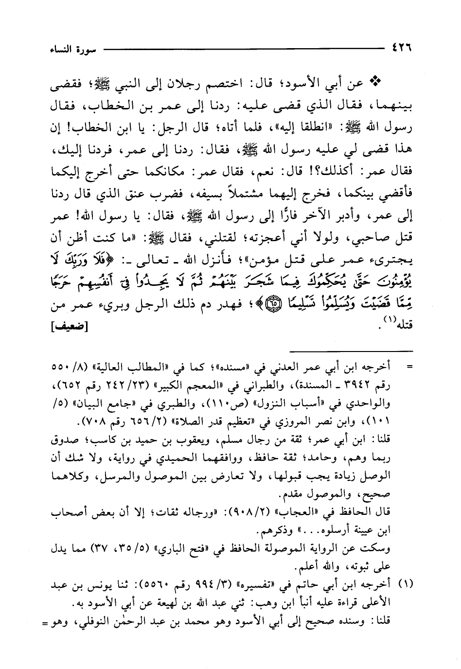 * عن أبي الأسود؛ قال: اختصم رجلان إلى النبي - صلى الله عليه وسلم -؛ فقضى بينهما، فقال الذي قضى عليه: ردنا إلى عمر بن الخطاب، فقال رسول الله - صلى الله عليه وسلم -: "انطلقا إليه"، فلما أتاه؛ قال الرجل: يا ابن الخطاب! إن هذا قضى لي عليه رسول الله - صلى الله عليه وسلم -، فقال: ردنا إلى عمر، فردنا إليك، فقال عمر: أكذلك؟! قال: نعم، فقال عمر: مكانكما حتى أخرج إليكما فأقضي بينكما، فخرج إليهما مشتملاً بسيفه، فضرب عنق الذي قال ردنا إلى عمر، وأدبر الآخر فارًّا إلى رسول الله - صلى الله عليه وسلم -، فقال: يا رسول الله! عمر قتل صاحبي، ولولا أني أعجزته؛ لقتلني، فقال - صلى الله عليه وسلم -: "ما كنت أظن أن يجترىء عمر على قتل مؤمن"؛ فأَنزل الله -تعالى-: {فَلَا وَرَبِّكَ لَا يُؤْمِنُونَ حَتَّى يُحَكِّمُوكَ فِيمَا شَجَرَ بَيْنَهُمْ ثُمَّ لَا يَجِدُوا في أَنْفُسِهِمْ حَرَجًا مِمَّا قَضَيْتَ وَيُسَلِّمُوا تَسْلِيمًا (65)} فهدر دم ذلك الرجل وبريء عمر من قتله (¬1). [ضعيف]