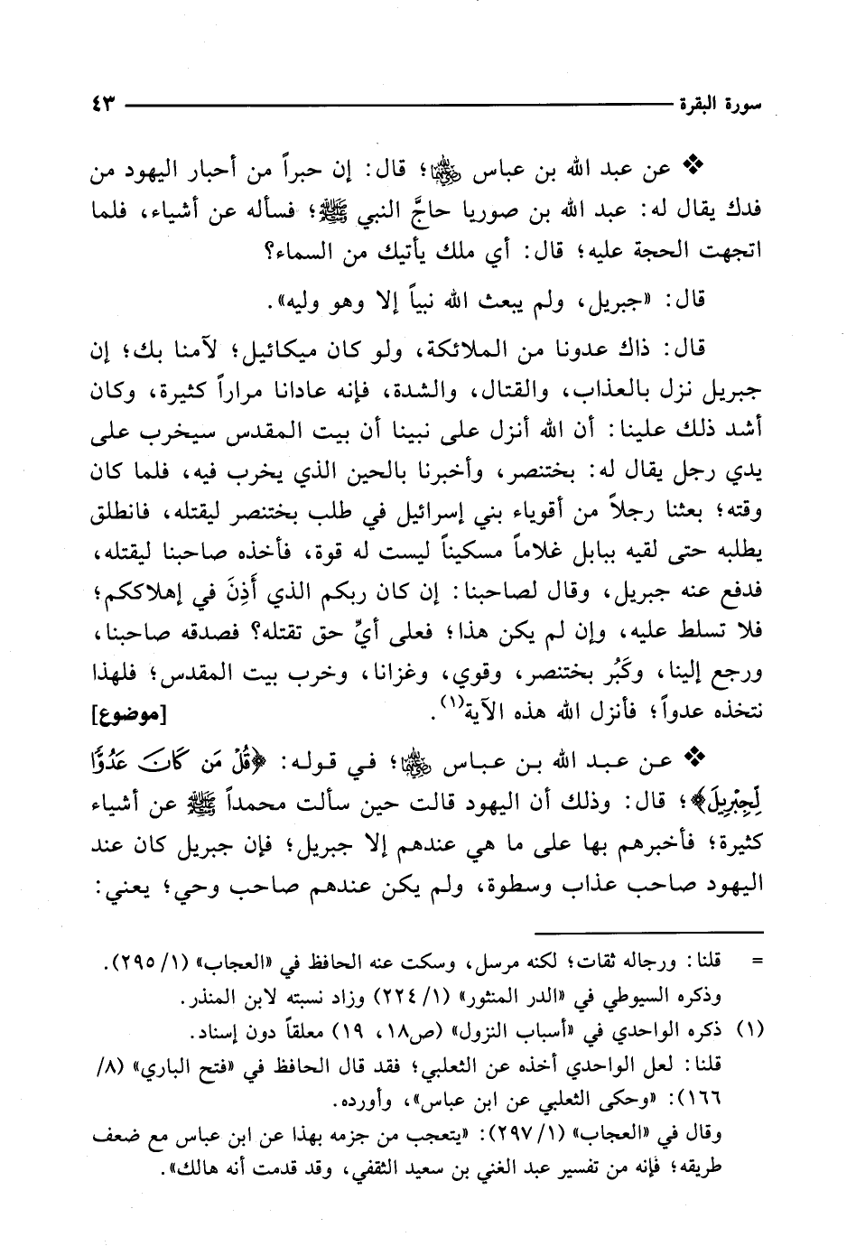 * عن عبد الله بن عباس -رضي الله عنهما-؛ في قوله: {قُلْ مَنْ كَانَ عَدُوًّا لِجِبْرِيلَ}؛ قال: وذلك أن اليهود قالت حين سألت محمداً - صلى الله عليه وسلم - عن أشياء كثيرة؛ فأخبرهم بها على ما هي عندهم إلا جبريل؛ فإن جبريل كان عند اليهود صاحب عذاب وسطوة، ولم يكن عندهم صاحب وحي؛ يعني: