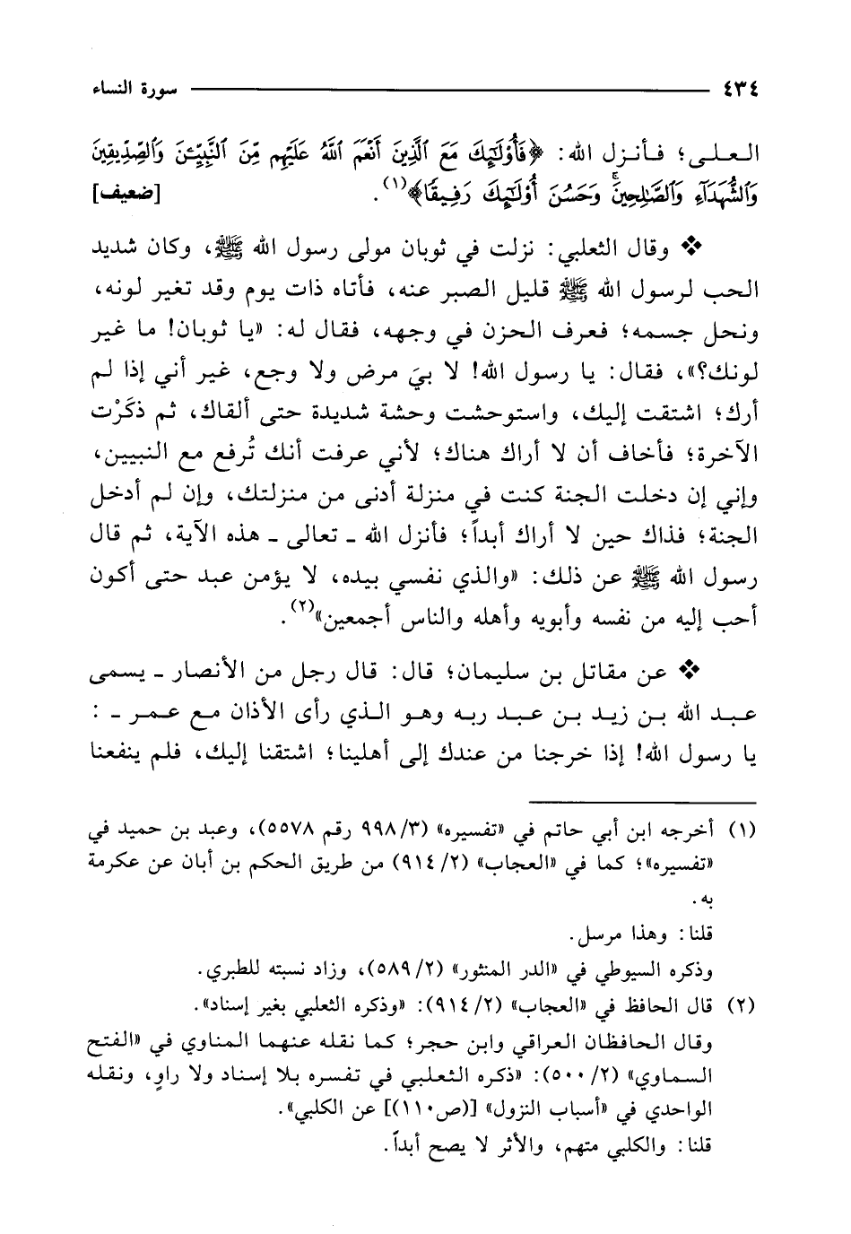 وقال الحافظان العراقي وابن حجر؛ كما نقله عنهما المناوي في "الفتح السماوي" (2/ 500): "ذكره الثعلبي في تفسره بلا إسناد ولا راوٍ، ونقله الواحدي في "أسباب النزول" [(ص 110)] عن الكلبي".