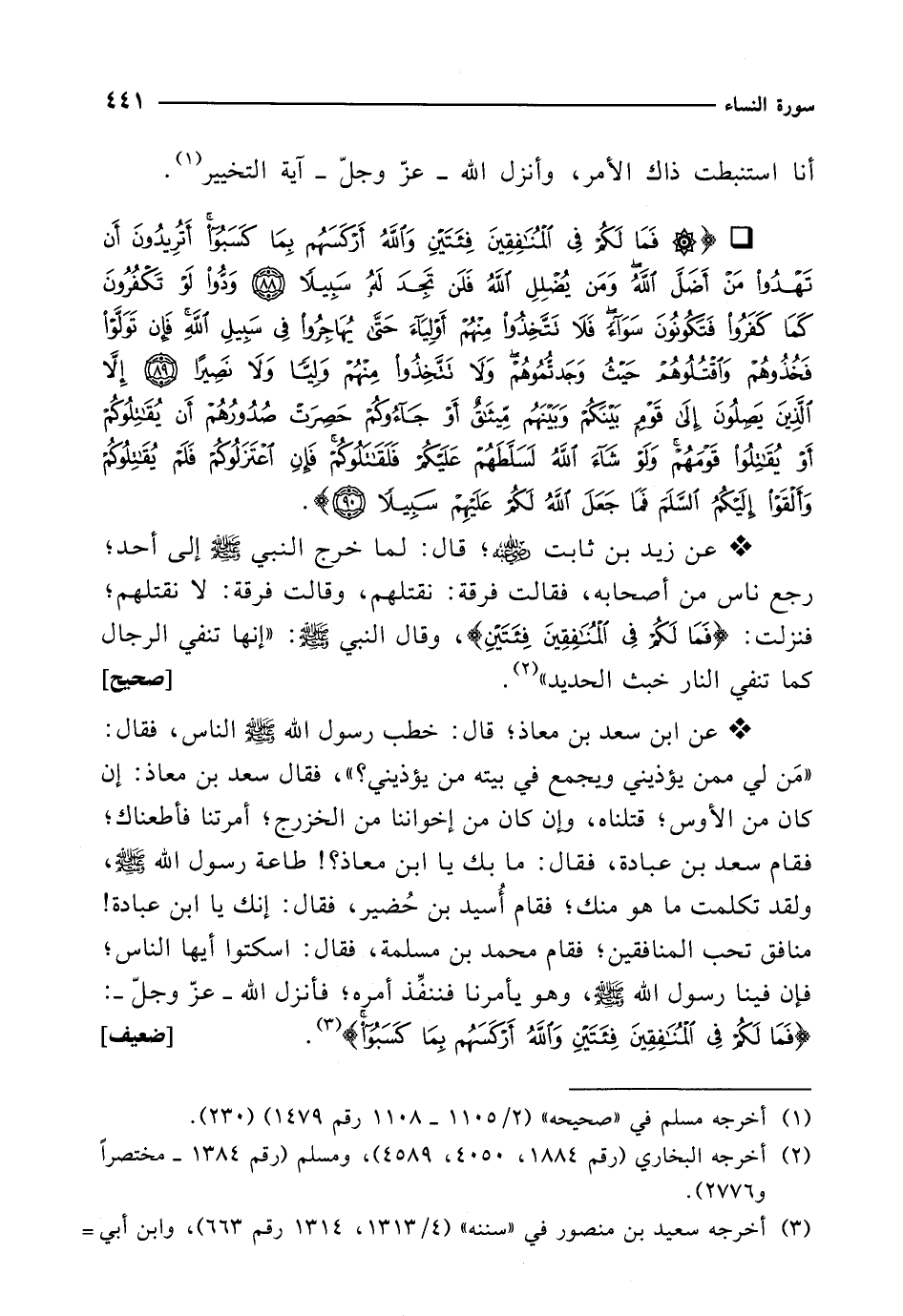 * عن ابن سعد بن معاذ؛ قال: خطب رسول الله - صلى الله عليه وسلم - الناس، فقال: "مَنَ لي ممن يؤذيني ويجمع في بيته من يؤذيني؟ "، فقال سعد بن معاذ: إن كان من الأوس؛ قتلناه، وإن كان من إخواننا من الخزرج؛ أمرتنا فأطعناك؛ فقام سعد بن عبادة، فقال: ما بك يا ابن معاذ؟! طاعة رسول الله - صلى الله عليه وسلم -، ولقد تكلمت ما هو منك؛ فقام أُسيد بن حُضير، فقال: إنك يا ابن عبادة! منافق تحب المنافقين؛ فقام محمد بن مسلمة، فقال: اسكتوا أيها الناس؛ فإن فينا رسول الله - صلى الله عليه وسلم -، وهو يأمرنا فننفِّذ أمره؛ فأنزل الله -عزّ وجلّ-: {فَمَا لَكُمْ في الْمُنَافِقِينَ فِئَتَيْنِ وَاللهُ أَرْكَسَهُمْ بِمَا كَسَبُوا} (¬3). [ضعيف]