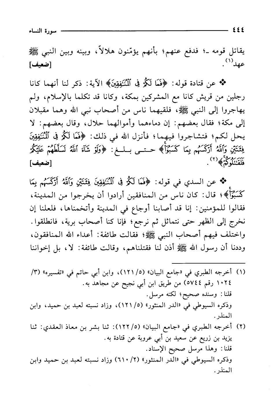 * عن قتادة قوله: {فَمَا لَكُمْ في الْمُنَافِقِينَ} الآية: ذكر لنا أنهما كانا رجلين من قريش كانا مع المشركين بمكة، وكانا قد تكلما بالإِسلام، ولم يهاجروا إلى النبي - صلى الله عليه وسلم -، فلقيهما ناس من أصحاب نبي الله وهما مقبلان إلى مكة؛ فقال بعضهم: إن دماءهما وأموالهما حلال، وقال بعضهم: لا يحل لكم؛ فتشاجروا فيهما؛ فأنزل الله في ذلك: {فَمَا لَكُمْ في الْمُنَافِقِينَ فِئَتَيْنِ وَاللهُ أَرْكَسَهُمْ بِمَا كَسَبُوا} حتى بلغ: {وَلَوْ شَاءَ الله لَسَلَّطَهُمْ عَلَيْكُمْ فَلَقَاتَلُوكُمْ} (¬2). [ضعيف]