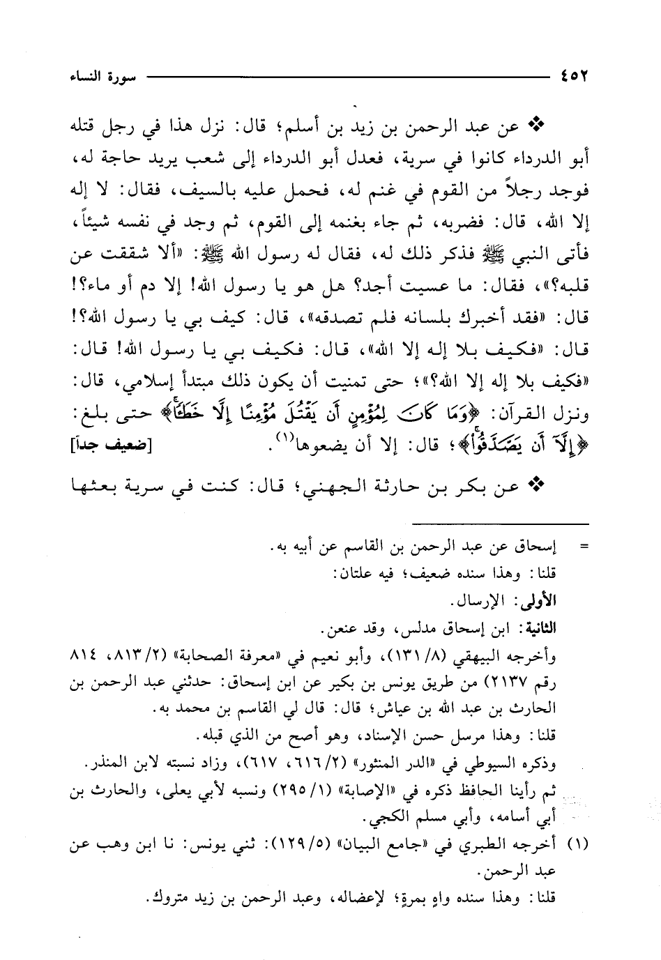 * عن عبد الرحمن بن زيد بن أسلم؛ قال: نزل هذا في رجل قتله أبو الدرداء كانوا في سرية، فعدل أبو الدرداء إلى شعب يريد حاجة له، فوجد رجلاً من القوم في غنم له، فحمل عليه بالسيف، فقال: لا إله إلا الله، قال: فضربه، ثم جاء بغنمه إلى القوم، ثم وجد في نفسه شيئاً، فأتى النبي - صلى الله عليه وسلم - فذكر ذلك له، فقال له رسول الله - صلى الله عليه وسلم -: "ألا شققت عن قلبه؟ "، فقال: ما عسيت أجد؟ هل هو يا رسول الله! إلا دم أو ماء؟! قال: "فقد أخبرك بلسانه فلم تصدقه"، قال: كيف بي يا رسول الله؟! قال: "فكيف بلا إله إلا الله"، قال: فكيف بي يا رسول الله! قال: "فكيف بلا إله إلا الله؟ "؛ حتى تمنيت أن يكون ذلك مبتدأ إسلامي، قال: ونزل القرآن: {وَمَا كَانَ لِمُؤْمِنٍ أَنْ يَقْتُلَ مُؤْمِنًا إِلَّا خَطَأً} حتى بلغ: {إِلَّا أَنْ يَصَّدَّقُوا}؛ قال: إلا أن يضعوها (¬1). [ضعيف جداً]
