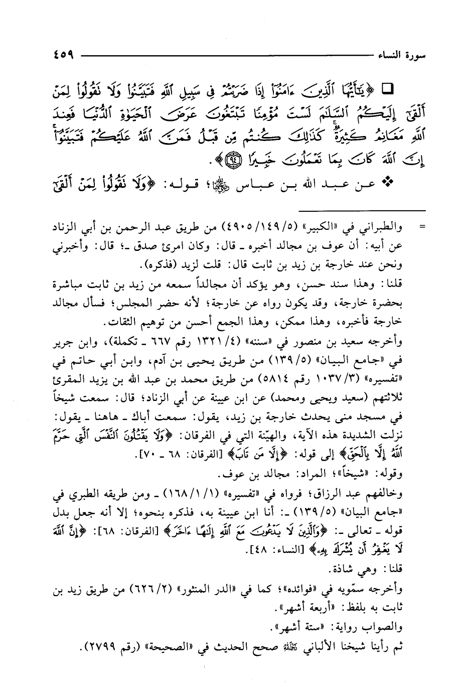 وخالفهم عبد الرزاق؛ فرواه في "تفسيره" (1/ 1/ 168) -ومن طريقه الطبري في "جامع البيان" (5/ 139) -: أنا ابن عيينة به، فذكره بنحوه؛ إلا أنه جعل بدل قوله -تعالى-: {وَالَّذِينَ لَا يَدْعُونَ مَعَ اللَّهِ إِلَهًا آخَرَ} [الفرقان: 68]: {إِنَّ اللَّهَ لَا يَغْفِرُ أَنْ يُشْرَكَ بِهِ} [النساء: 48].