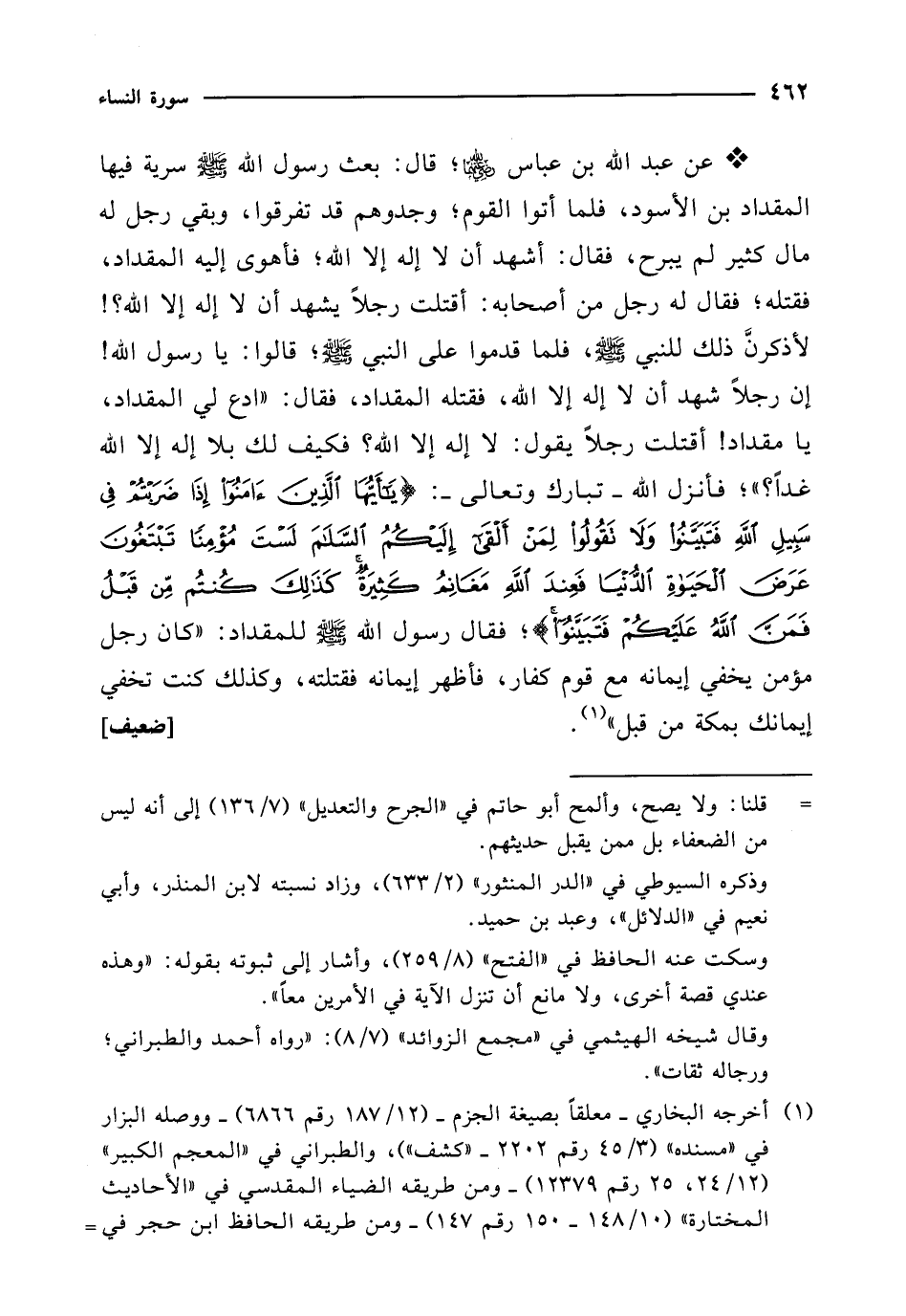 * عن عبد الله بن عباس -رضي الله عنهما-؛ قال: بعث رسول الله - صلى الله عليه وسلم - سرية فيها المقداد بن الأسود، فلما أتوا القوم؛ وجدوهم قد تفرقوا، وبقي رجل له مال كثير لم يبرح، فقال: أشهد أن لا إله إلا الله؛ فأهوى إليه المقداد، فقتله؛ فقال له رجل من أصحابه: أقتلت رجلاً يشهد أن لا إله إلا الله؟! لأذكرنَّ ذلك للنبي - صلى الله عليه وسلم -، فلما قدموا على النبي - صلى الله عليه وسلم -؛ قالوا: يا رسول الله! إن رجلاً شهد أن لا إله إلا الله، فقتله المقداد، فقال: "ادع لي المقداد، يا مقداد! أقتلت رجلاً يقول: لا إله إلا الله؟ فكيف لك بلا إله إلا الله غداً؟ "؛ فأنزل الله -تبارك وتعالى-: {يَاأَيُّهَا الَّذِينَ آمَنُوا إِذَا ضَرَبْتُمْ فِي سَبِيلِ اللَّهِ فَتَبَيَّنُوا وَلَا تَقُولُوا لِمَنْ أَلْقَى إِلَيْكُمُ السَّلَامَ لَسْتَ مُؤْمِنًا تَبْتَغُونَ عَرَضَ الْحَيَاةِ الدُّنْيَا فَعِنْدَ اللَّهِ مَغَانِمُ كَثِيرَةٌ كَذَلِكَ كُنْتُمْ مِنْ قَبْلُ فَمَنَّ اللَّهُ عَلَيْكُمْ فَتَبَيَّنُوا}؛ فقال رسول الله - صلى الله عليه وسلم - للمقداد: "كان رجل مؤمن يخفي إيمانه مع قوم كفار، فأظهر إيمانه فقتلته، وكذلك كنت تخفي إيمانك بمكة من قبل" (¬1). [ضعيف]