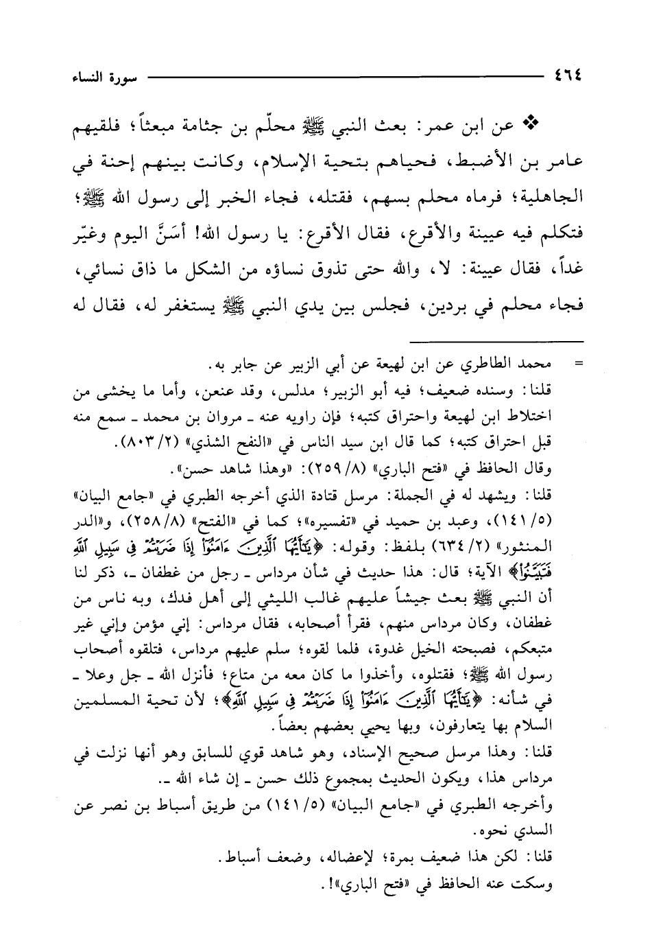 قلنا: ويشهد له في الجملة: مرسل قتادة الذي أخرجه الطبري في "جامع البيان" (5/ 141)، وعبد بن حميد في "تفسيره"؛ كما في "الفتح" (8/ 258)، و"الدر المنثور" (2/ 634) بلفظ: وقوله: {يَاأَيُّهَا الَّذِينَ آمَنُوا إِذَا ضَرَبْتُمْ فِي سَبِيلِ اللَّهِ فَتَبَيَّنُوا} الآية؛ قال: هذا حديث في شأن مرداس -رجل من غطفان-، ذكر لنا أن النبي - صلى الله عليه وسلم - بعث جيشاً عليهم غالب الليثي إلى أهل فدك، وبه ناس من غطفان، وكان مرداس منهم، فقرأ أصحابه، فقال مرداس: إني مؤمن وإني غير متبعكم، فصبحته الخيل غدوة، فلما لقوه؛ سلم عليهم مرداس، فتلقوه أصحاب رسول الله - صلى الله عليه وسلم -؛ فقتلوه، وأخذوا ما كان معه من متاع؛ فأنزل الله -جل وعلا- في شأنه: {يَاأَيُّهَا الَّذِينَ آمَنُوا إِذَا ضَرَبْتُمْ فِي سَبِيلِ اللَّهِ}؛ لأن تحية المسلمين السلام بها يتعارفون، وبها يحيي بعضهم بعضاً.
