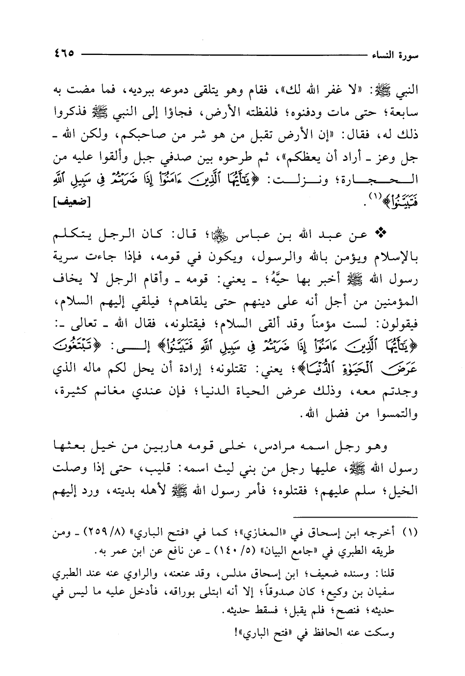 * عن عبد الله بن عباس -رضي الله عنهما-؛ قال: كان الرجل يتكلم بالإِسلام ويؤمن بالله والرسول، ويكون في قومه، فإذا جاءت سرية رسول الله - صلى الله عليه وسلم - أخبر بها حيَّهُ؛ -يعني: قومه- وأقام الرجل لا يخاف المؤمنين من أجل أنه على دينهم حتى يلقاهم؛ فيلقي إليهم السلام، فيقولون: لست مؤمناً وقد ألقى السلام؛ فيقتلونه، فقال الله -تعالى-: {يَاأَيُّهَا الَّذِينَ آمَنُوا إِذَا ضَرَبْتُمْ فِي سَبِيلِ اللَّهِ فَتَبَيَّنُوا} إلى: {تَبْتَغُونَ عَرَضَ الْحَيَاةِ الدُّنْيَا}؛ يعني: تقتلونه؛ إرادة أن يحل لكم ماله الذي وجدتم معه، وذلك عرض الحياة الدنيا؛ فإن عندي مغانم كثيرة، والتمسوا من فضل الله.