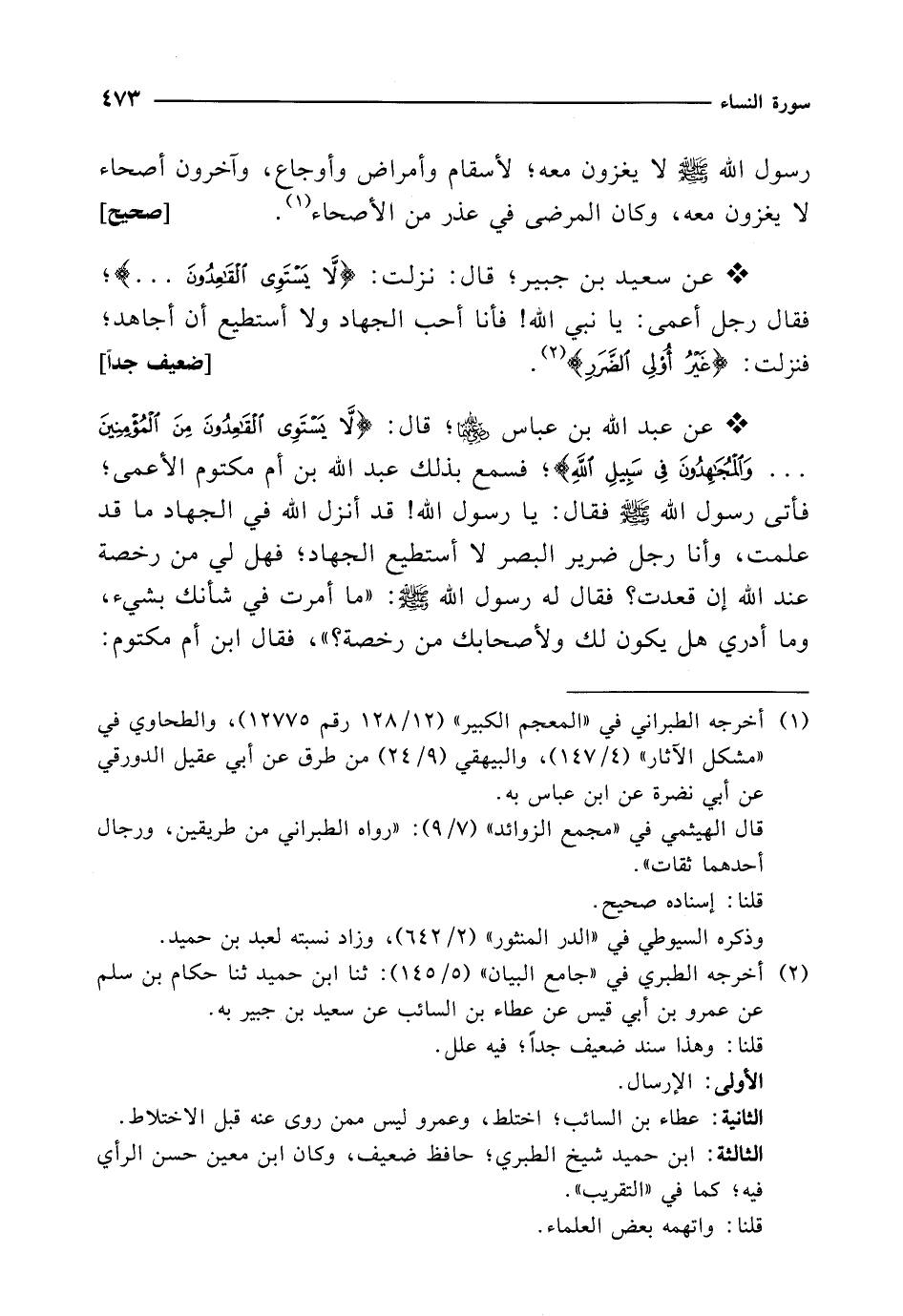 * عن سعيد بن جبير؛ قال: نزلت: {لَا يَسْتَوِي الْقَاعِدُونَ. . .}؛ فقال رجل أعمى: يا نبي الله! فأنا أحب الجهاد ولا أستطيع أن أجاهد؛ فنزلت: {غَيْرُ أُولِي الضَّرَرِ} (¬2). [ضعيف جداً]