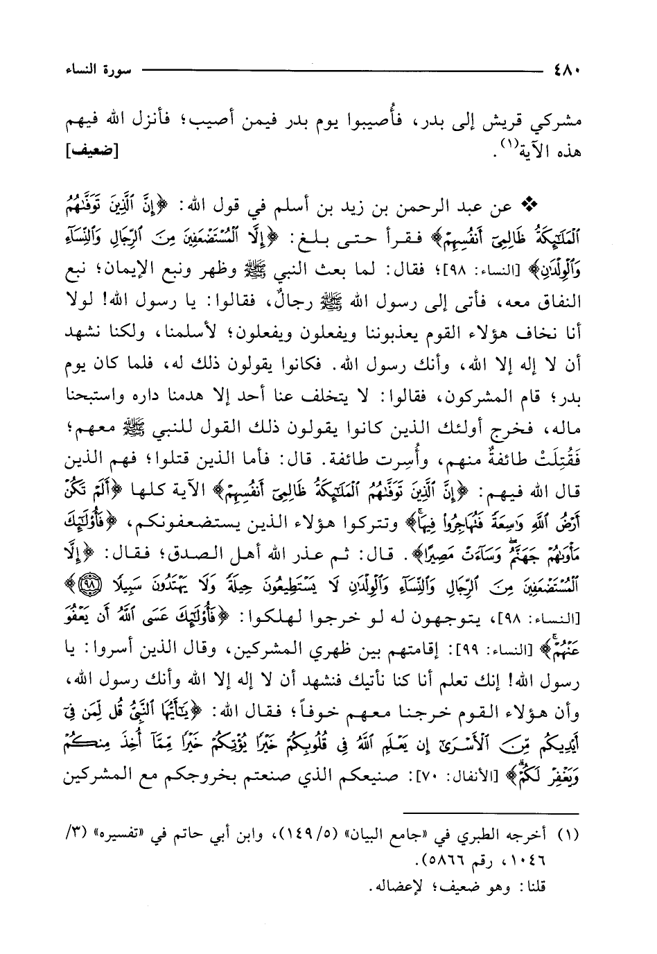 * عن عبد الرحمن بن زيد بن أسلم في قول الله: {إِنَّ الَّذِينَ تَوَفَّاهُمُ الْمَلَائِكَةُ ظَالِمِي أَنْفُسِهِمْ} فقرأ حتى بلغ: {إِلَّا الْمُسْتَضْعَفِينَ مِنَ الرِّجَالِ وَالنِّسَاءِ وَالْوِلْدَانِ} [النساء: 98]؛ فقال: لما بعث النبي - صلى الله عليه وسلم - وظهر ونبع الإيمان؛ نبع النفاق معه، فأتى إلى رسول الله - صلى الله عليه وسلم - رجالٌ، فقالوا: يا رسول الله! لولا أنا نخاف هؤلاء القوم يعذبوننا ويفعلون ويفعلون؛ لأسلمنا، ولكنا نشهد أن لا إله إلا الله، وأنك رسول الله. فكانوا يقولون ذلك له، فلما كان يوم بدر؛ قام المشركون، فقالوا: لا يتخلف عنا أحد إلا هدمنا داره واستبحنا ماله، فخرج أولئك الذين كانوا يقولون ذلك القول للنبي - صلى الله عليه وسلم - معهم؛ فَقُتِلَتْ طائفةٌ منهم، وأُسِرت طائفة. قال: فأما الذين قتلوا؛ فهم الذين قال الله فيهم: {إِنَّ الَّذِينَ تَوَفَّاهُمُ الْمَلَائِكَةُ ظَالِمِي أَنْفُسِهِمْ} الآية كلها {أَلَمْ تَكُنْ أَرْضُ اللَّهِ وَاسِعَةً فَتُهَاجِرُوا فِيهَا} وتتركوا هؤلاء الذين يستضعفونكم، {فَأُولَئِكَ مَأْوَاهُمْ جَهَنَّمُ وَسَاءَتْ مَصِيرًا}. قال: ثم عذر الله أهل الصدق؛ فقال: {إِلَّا الْمُسْتَضْعَفِينَ مِنَ الرِّجَالِ وَالنِّسَاءِ وَالْوِلْدَانِ لَا يَسْتَطِيعُونَ حِيلَةً وَلَا يَهْتَدُونَ سَبِيلًا (98)} [النساء: 98]، يتوجهون له لو خرجوا لهلكوا: {فَأُولَئِكَ عَسَى اللَّهُ أَنْ يَعْفُوَ عَنْهُمْ} [النساء: 99]: إقامتهم بين ظهري المشركين، وقال الذين أسروا: يا رسول الله! إنك تعلم أنا كنا نأتيك فنشهد أن لا إله إلا الله وأنك رسول الله، وأن هؤلاء القوم خرجنا معهم خوفاً؛ فقال الله: {يَاأَيُّهَا النَّبِيُّ قُلْ لِمَنْ فِي أَيْدِيكُمْ مِنَ الْأَسْرَى إِنْ يَعْلَمِ اللَّهُ فِي قُلُوبِكُمْ خَيْرًا يُؤْتِكُمْ خَيْرًا مِمَّا أُخِذَ مِنْكُمْ وَيَغْفِرْ لَكُمْ} [الأنفال: 70]: صنيعكم الذي صنعتم بخروجكم مع المشركين