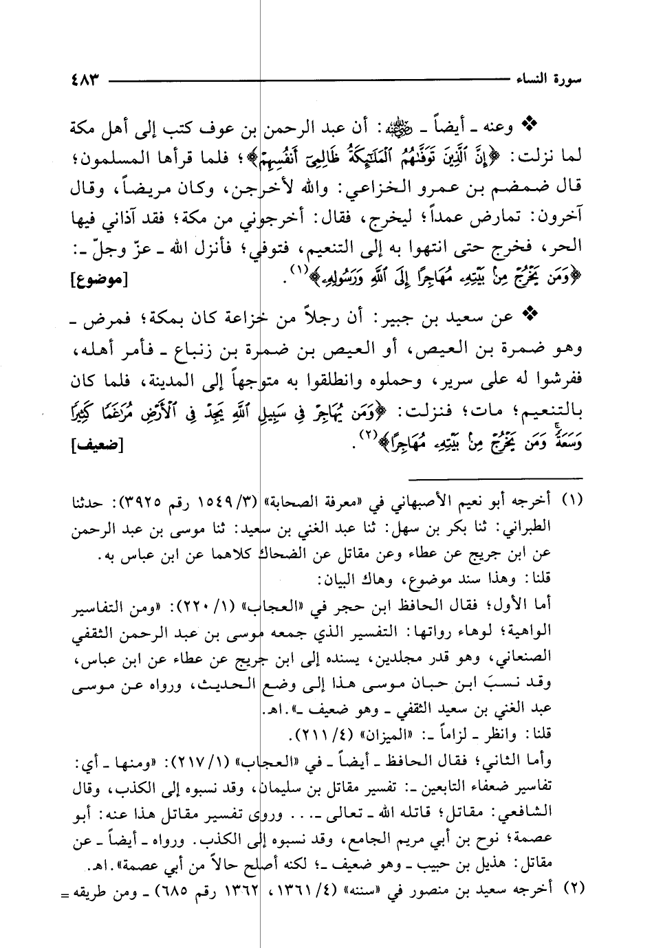 * عن سعيد بن جبير: أن رجلاً من خزاعة كان بمكة؛ فمرض -وهو ضمرة بن العيص، أو العيص بن ضمرة بن زنباع- فأمر أهله، ففرشوا له على سرير، وحملوه وانطلقوا به متوجهاً إلى المدنية، فلما كان بالنتعيم؛ مات؛ فنزلت: {وَمَنْ يُهَاجِرْ فِي سَبِيلِ اللَّهِ يَجِدْ فِي الْأَرْضِ مُرَاغَمًا كَثِيرًا وَسَعَةً وَمَنْ يَخْرُجْ مِنْ بَيْتِهِ مُهَاجِرًا} (¬2). [ضعيف]