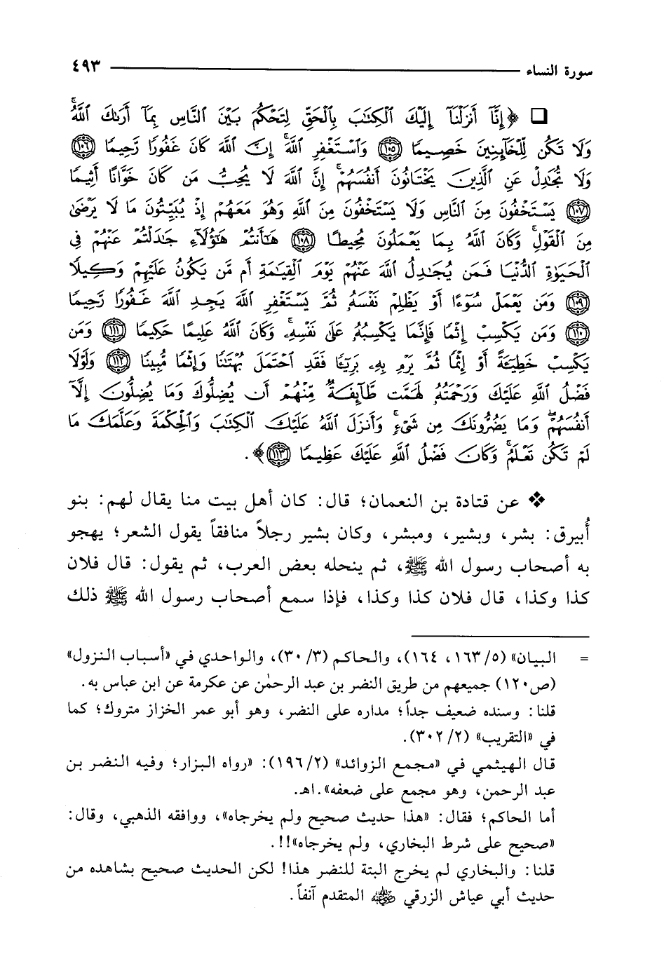 {إِنَّا أَنْزَلْنَا إِلَيْكَ الْكِتَابَ بِالْحَقِّ لِتَحْكُمَ بَيْنَ النَّاسِ بِمَا أَرَاكَ اللَّهُ وَلَا تَكُنْ لِلْخَائِنِينَ خَصِيمًا (105) وَاسْتَغْفِرِ اللَّهَ إِنَّ اللَّهَ كَانَ غَفُورًا رَحِيمًا (106) وَلَا تُجَادِلْ عَنِ الَّذِينَ يَخْتَانُونَ أَنْفُسَهُمْ إِنَّ اللَّهَ لَا يُحِبُّ مَنْ كَانَ خَوَّانًا أَثِيمًا (107) يَسْتَخْفُونَ مِنَ النَّاسِ وَلَا يَسْتَخْفُونَ مِنَ اللَّهِ وَهُوَ مَعَهُمْ إِذْ يُبَيِّتُونَ مَا لَا يَرْضَى مِنَ الْقَوْلِ وَكَانَ اللَّهُ بِمَا يَعْمَلُونَ مُحِيطًا (108) هَاأَنْتُمْ هَؤُلَاءِ جَادَلْتُمْ عَنْهُمْ فِي الْحَيَاةِ الدُّنْيَا فَمَنْ يُجَادِلُ اللَّهَ عَنْهُمْ يَوْمَ الْقِيَامَةِ أَمْ مَنْ يَكُونُ عَلَيْهِمْ وَكِيلًا (109) وَمَنْ يَعْمَلْ سُوءًا أَوْ يَظْلِمْ نَفْسَهُ ثُمَّ يَسْتَغْفِرِ اللَّهَ يَجِدِ اللَّهَ غَفُورًا رَحِيمًا (110) وَمَنْ يَكْسِبْ إِثْمًا فَإِنَّمَا يَكْسِبُهُ عَلَى نَفْسِهِ وَكَانَ اللَّهُ عَلِيمًا حَكِيمًا (111) وَمَنْ يَكْسِبْ خَطِيئَةً أَوْ إِثْمًا ثُمَّ يَرْمِ بِهِ بَرِيئًا فَقَدِ احْتَمَلَ بُهْتَانًا وَإِثْمًا مُبِينًا (112) وَلَوْلَا فَضْلُ اللَّهِ عَلَيْكَ وَرَحْمَتُهُ لَهَمَّتْ طَائِفَةٌ مِنْهُمْ أَنْ يُضِلُّوكَ وَمَا يُضِلُّونَ إِلَّا أَنْفُسَهُمْ وَمَا يَضُرُّونَكَ مِنْ شَيْءٍ وَأَنْزَلَ اللَّهُ عَلَيْكَ الْكِتَابَ وَالْحِكْمَةَ وَعَلَّمَكَ مَا لَمْ تَكُنْ تَعْلَمُ وَكَانَ فَضْلُ اللَّهِ عَلَيْكَ عَظِيمًا (113)}.