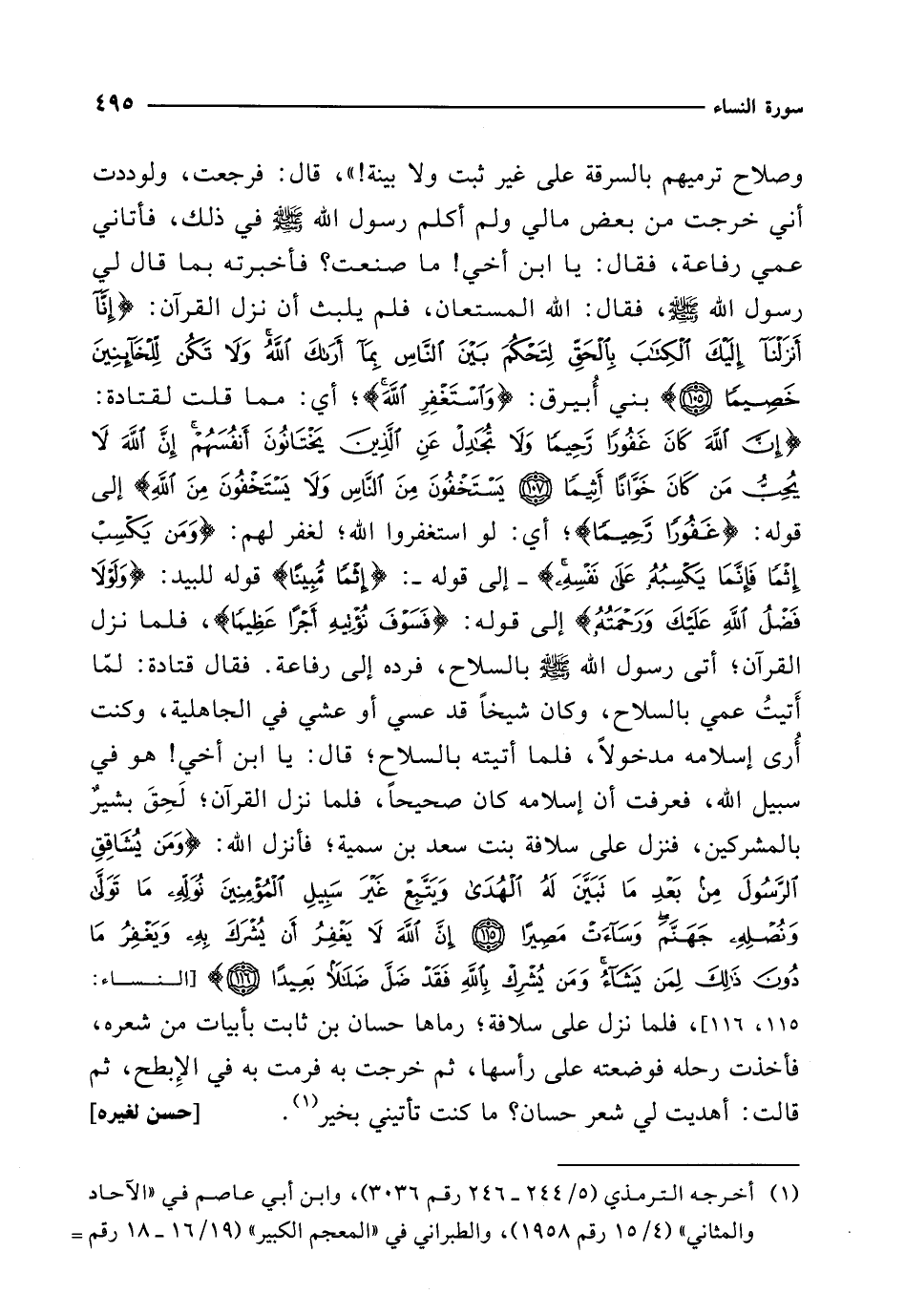 وصلاح ترميهم بالسرقة على غير ثبت ولا بينة! "، قال: فرجعت، ولوددت أني خرجت من بعض مالي ولم أكلم رسول الله - صلى الله عليه وسلم - في ذلك، فأتاني عمي رفاعة، فقال: يا ابن أخي! ما صنعت؟ فأخبرته بما قال لي رسول الله - صلى الله عليه وسلم -، فقال: الله المستعان، فلم يلبث أن نزل القرآن: {إِنَّا أَنْزَلْنَا إِلَيْكَ الْكِتَابَ بِالْحَقِّ لِتَحْكُمَ بَيْنَ النَّاسِ بِمَا أَرَاكَ اللَّهُ وَلَا تَكُنْ لِلْخَائِنِينَ خَصِيمًا (105)} بني أُبيرق: {وَاسْتَغْفِرِ اللَّهَ}؛ أي: مما قلت لقتادة: {إِنَّ اللَّهَ كَانَ غَفُورًا رَحِيمًا وَلَا تُجَادِلْ عَنِ الَّذِينَ يَخْتَانُونَ أَنْفُسَهُمْ إِنَّ اللَّهَ لَا يُحِبُّ مَنْ كَانَ خَوَّانًا أَثِيمًا (107) يَسْتَخْفُونَ مِنَ النَّاسِ وَلَا يَسْتَخْفُونَ مِنَ اللَّهِ} إلى قوله: {غَفُورًا رَحِيمًا}؛ أي: لو استغفروا الله؛ لغفر لهم: {وَمَنْ يَكْسِبْ إِثْمًا فَإِنَّمَا يَكْسِبُهُ عَلَى نَفْسِهِ} -إلى قوله-: {وَإِثْمًا مُبِينًا} قوله للبيد: {وَلَوْلَا فَضْلُ اللَّهِ عَلَيْكَ وَرَحْمَتُهُ} إلى قوله: {فَسَوْفَ نُؤْتِيهِ أَجْرًا عَظِيمًا}، فلما نزل القرآن؛ أتى رسول الله - صلى الله عليه وسلم - بالسلاح، فرده إلى رفاعة. فقال قتادة: لمّا أَتيتُ عمي بالسلاح، وكان شيخاً قد عسي أو عشي في الجاهلية، وكنت أُرى إسلامه مدخولاً، فلما أتيته بالسلاح؛ قال: يا ابن أخي! هو في سبيل الله، فعرفت أن إسلامه كان صحيحاً، فلما نزل القرآن؛ لَحِقَ بشيرٌ بالمشركين، فنزل على سلافة بنت سعد بن سمية؛ فأنزل الله: {وَمَنْ يُشَاقِقِ الرَّسُولَ مِنْ بَعْدِ مَا تَبَيَّنَ لَهُ الْهُدَى وَيَتَّبِعْ غَيْرَ سَبِيلِ الْمُؤْمِنِينَ نُوَلِّهِ مَا تَوَلَّى وَنُصْلِهِ جَهَنَّمَ وَسَاءَتْ مَصِيرًا (115) إِنَّ اللَّهَ لَا يَغْفِرُ أَنْ يُشْرَكَ بِهِ وَيَغْفِرُ مَا دُونَ ذَلِكَ لِمَنْ يَشَاءُ وَمَنْ يُشْرِكْ بِاللَّهِ فَقَدْ ضَلَّ ضَلَالًا بَعِيدًا (116)} [النساء: 115، 116]، فلما نزل على سلافة؛ رماها حسان بن ثابت بأبيات من شعره، فأخذت رحله فوضعته على رأسها، ثم خرجت به فرمت به في الإِبطح، ثم قالت: أهديت لي شعر حسان؟ ما كنت تأتيني بخير (¬1). [حسن لغيره]