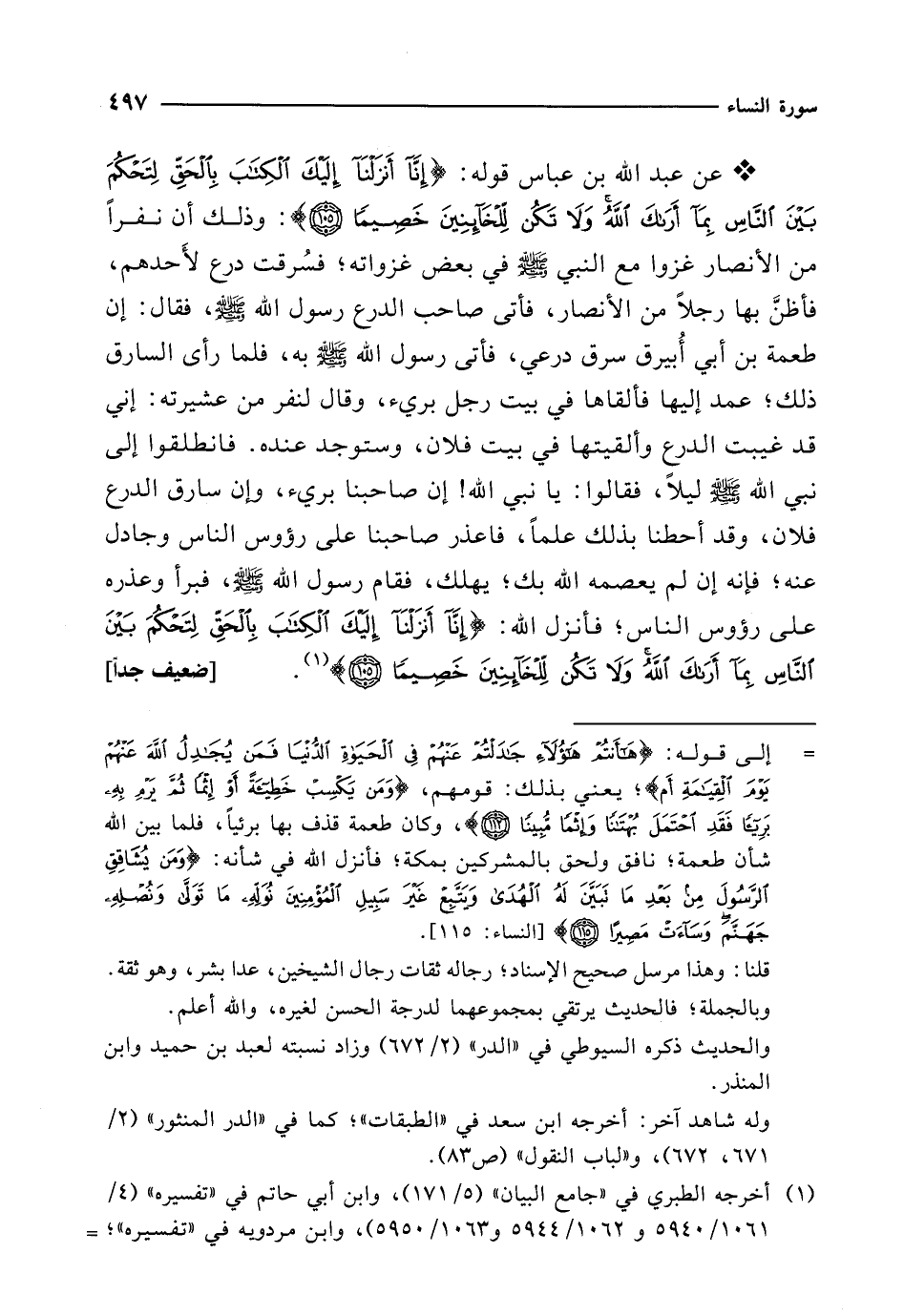 * عن عبد الله بن عباس قوله: {إِنَّا أَنْزَلْنَا إِلَيْكَ الْكِتَابَ بِالْحَقِّ لِتَحْكُمَ بَيْنَ النَّاسِ بِمَا أَرَاكَ اللَّهُ وَلَا تَكُنْ لِلْخَائِنِينَ خَصِيمًا (105)}: وذلك أن نفراً من الأنصار غزوا مع النبي - صلى الله عليه وسلم - في بعض غزواته؛ فسُرقت درع لأَحدهم، فأظنَّ بها رجلاً من الأنصار، فأتى صاحب الدرع رسول الله - صلى الله عليه وسلم -، فقال: إن طعمة بن أبي أُبيرق سرق درعي، فأتى رسول الله - صلى الله عليه وسلم - به، فلما رأى السارق ذلك؛ عمد إليها فألقاها في بيت رجل بريء، وقال لنفر من عشيرته: إني قد غيبت الدرع وألقيتها في بيت فلان، وستوجد عنده. فانطلقوا إلى نبي الله - صلى الله عليه وسلم - ليلاً، فقالوا: يا نبي الله! إن صاحبنا بريء، وإن سارق الدرع فلان، وقد أحطنا بذلك علماً، فاعذر صاحبنا على رؤوس الناس وجادل عنه؛ فإنه إن لم يعصمه الله بك؛ يهلك، فقام رسول الله - صلى الله عليه وسلم -، فبرأ وعذره على رؤوس الناس؛ فأنزل الله: {إِنَّا أَنْزَلْنَا إِلَيْكَ الْكِتَابَ بِالْحَقِّ لِتَحْكُمَ بَيْنَ النَّاسِ بِمَا أَرَاكَ اللَّهُ وَلَا تَكُنْ لِلْخَائِنِينَ خَصِيمًا (105)} (¬1). [ضعيف جداً]