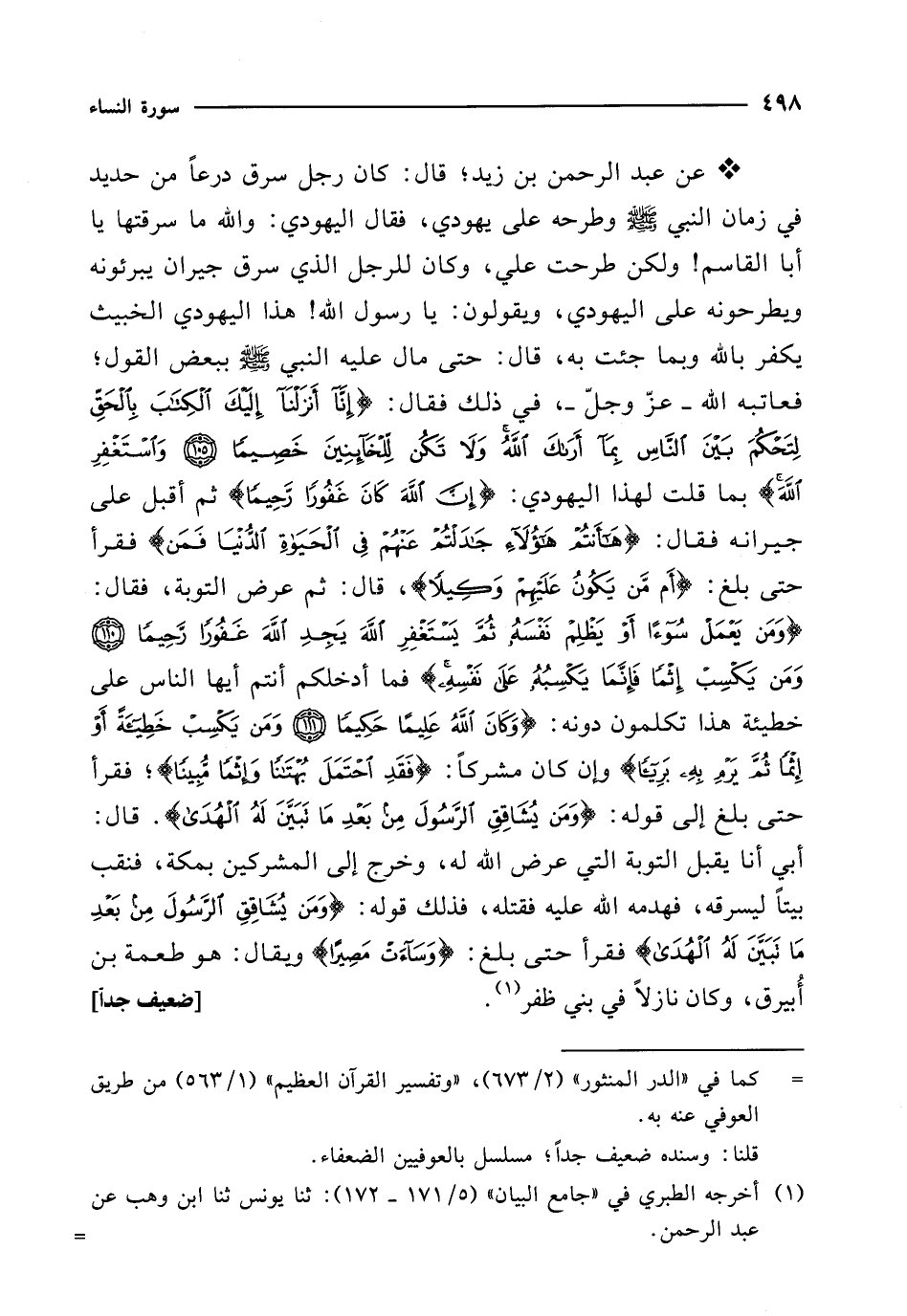 * عن عبد الرحمن بن زيد؛ قال: كان رجل سرق درعاً من حديد في زمان النبي - صلى الله عليه وسلم - وطرحه على يهودي، فقال اليهودي: والله ما سرقتها يا أبا القاسم! ولكن طرحت علي، وكان للرجل الذي سرق جيران يبرئونه ويطرحونه على اليهودي، ويقولون: يا رسول الله! هذا اليهودي الخبيث يكفر بالله وبما جئت به، قال: حتى مال عليه النبي - صلى الله عليه وسلم - ببعض القول؛ فعاتبه الله -عزّ وجلّ-، في ذلك فقال: {إِنَّا أَنْزَلْنَا إِلَيْكَ الْكِتَابَ بِالْحَقِّ لِتَحْكُمَ بَيْنَ النَّاسِ بِمَا أَرَاكَ الله وَلَا تَكُنْ لِلْخَائِنِينَ خَصِيمًا (105) وَاسْتَغْفِرِ اللهَ} بما قلت لهذا اليهودي: {إِنَّ اللهَ كَانَ غَفُورًا رَحِيمًا} ثم أقبل على جيرانه فقال: {هَاأَنْتُمْ هَؤُلَاءِ جَادَلْتُمْ عَنْهُمْ في الْحَيَاةِ الدُّنْيَا فَمَنْ} فقرأ حتى بلغ: {أَمْ مَنْ يَكُونُ عَلَيْهِمْ وَكِيلًا}، قال: ثم عرض التوبة، فقال: {وَمَنْ يَعْمَلْ سُوءًا أَوْ يَظْلِمْ نَفْسَهُ ثُمَّ يَسْتَغْفِرِ اللهَ يَجِدِ اللهَ غَفُورًا رَحِيمًا (110) وَمَنْ يَكْسِبْ إِثْمًا فَإِنَّمَا يَكْسِبُهُ عَلَى نَفْسِهِ} فما أدخلكم أنتم أيها الناس على خطيئة هذا تكلمون دونه: {وَكَانَ الله عَلِيمًا حَكِيمًا (111) وَمَنْ يَكْسِبْ خَطِيئَةً أَوْ إِثْمًا ثُمَّ يَرْمِ بِهِ بَرِيئًا} إن كان مشركاً: {فَقَدِ احْتَمَلَ بُهْتَانًا وَإِثْمًا مُبِينًا}؛ فقرأ حتى بلغ إلى قوله: {وَمَنْ يُشَاقِقِ الرَّسُولَ مِنْ بَعْدِ مَا تَبَيَّنَ لَهُ الْهُدَى}. قال: أبي أنا يقبل التوبة التي عرض الله له، وخرج إلى المشركين بمكة، فنقب بيتاً ليسرقه، فهدمه الله عليه فقتله، فذلك قوله: {وَمَنْ يُشَاقِقِ الرَّسُولَ مِنْ بَعْدِ مَا تَبَيَّنَ لَهُ الْهُدَى} فقرأ حتى بلغ: {وَسَاءَتْ مَصِيرًا} ويقال: هو طعمة بن أُبيرق، وكان نازلاً في بني ظفر (¬1). [ضعيف جداً]