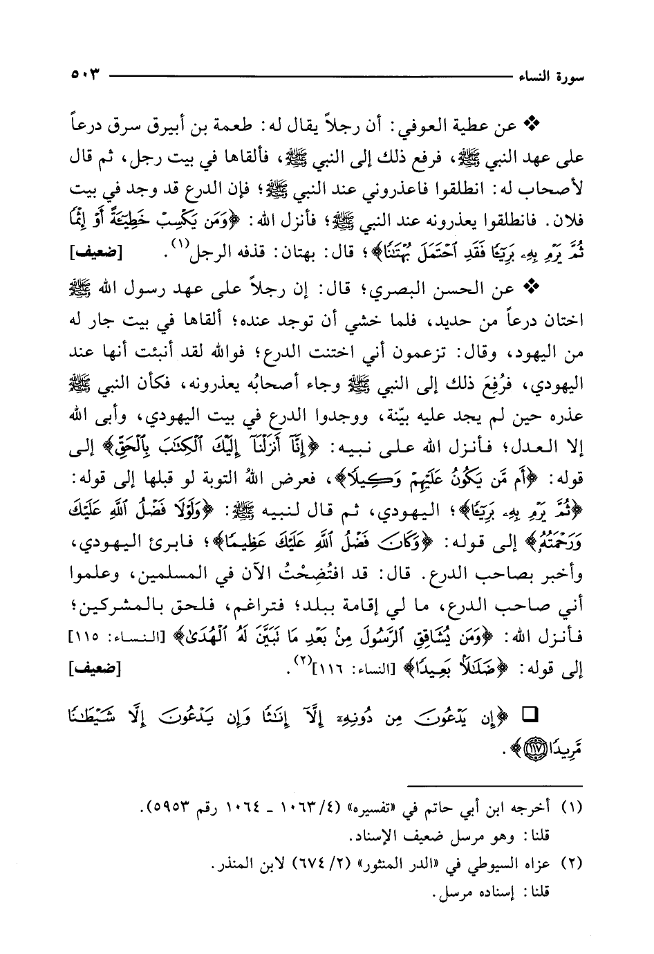 * عن عطية العوفي: أن رجلًا يقال له: طعمة بن أبيرق سرق درعاً على عهد النبي - صلى الله عليه وسلم -، فرفع ذلك إلى النبي - صلى الله عليه وسلم -، فألقاها في بيت رجل، ثم قال لأصحاب له: انطلقوا فاعذروني عند النبي - صلى الله عليه وسلم -؛ فإن الدرع قد وجد في بيت فلان. فانطلقوا يعذرونه عند النبي - صلى الله عليه وسلم -؛ فأنزل الله: {وَمَنْ يَكْسِبْ خَطِيئَةً أَوْ إِثْمًا ثُمَّ يَرْمِ بِهِ بَرِيئًا فَقَدِ احْتَمَلَ بُهْتَانًا}؛ قال: بهتان: قذفه الرجل (¬1). [ضعيف]