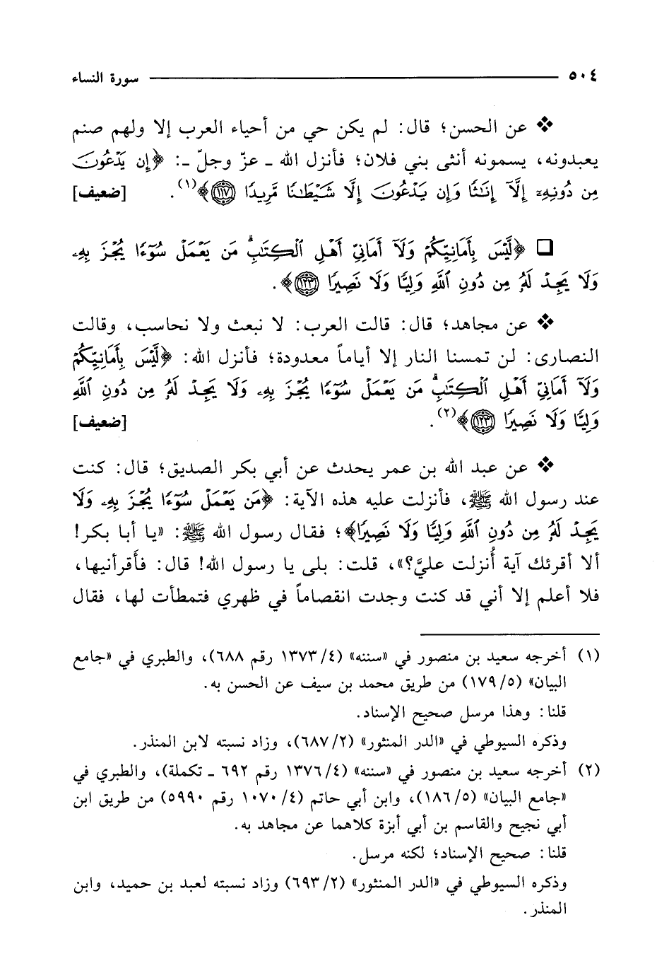 * عن مجاهد؛ قال: قالت العرب: لا نبعث ولا نحاسب، وقالت النصارى: لن تمسنا النار إلا أياماً معدودة؛ فأنزل الله: {لَيْسَ بِأَمَانِيِّكُمْ وَلَا أَمَانِيِّ أَهْلِ الْكِتَابِ مَنْ يَعْمَلْ سُوءًا يُجْزَ بِهِ وَلَا يَجِدْ لَهُ مِنْ دُونِ اللَّهِ وَلِيًّا وَلَا نَصِيرًا (123)} (¬2). [ضعيف]