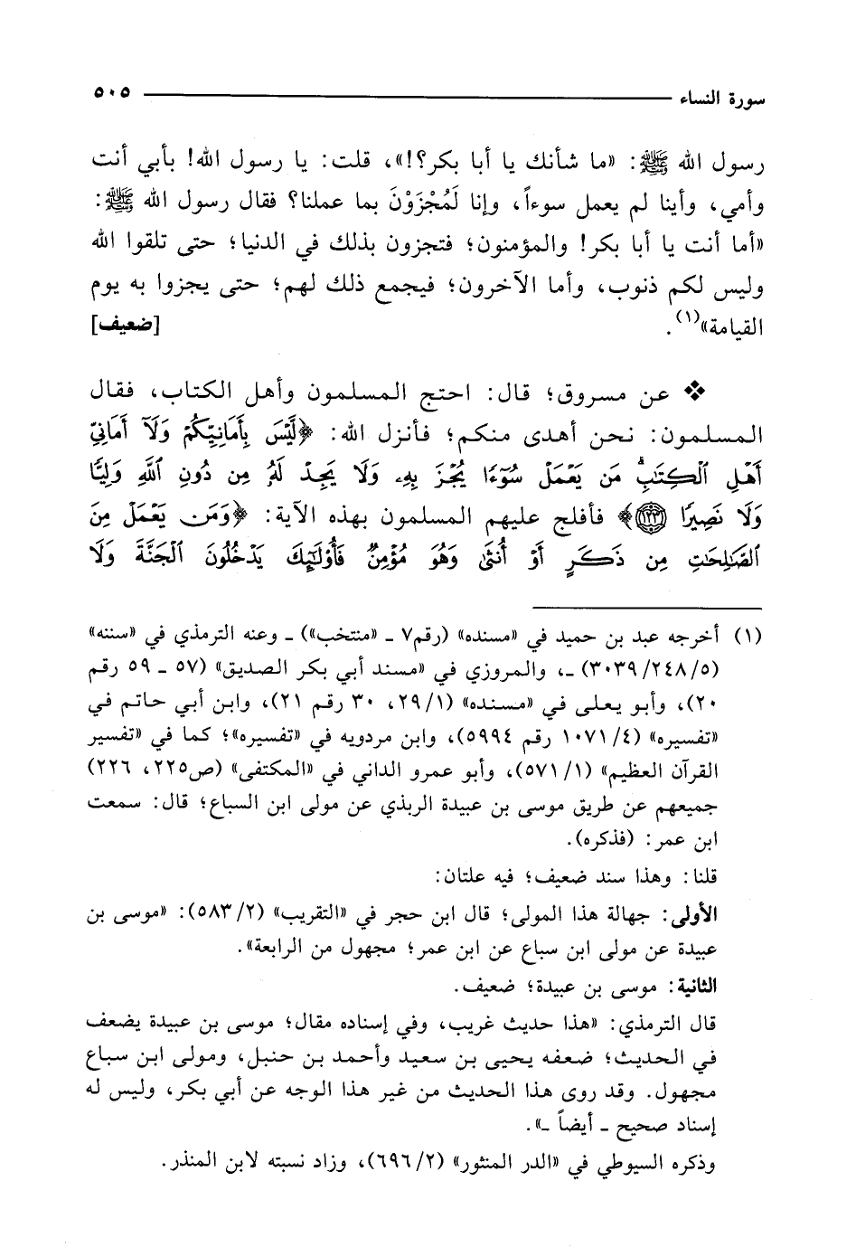 * عن مسروق؛ قال: احتج المسلمون وأهل الكتاب، فقال المسلمون: نحن أهدى منكم؛ فأنزل الله: {لَيْسَ بِأَمَانِيِّكُمْ وَلَا أَمَانِيِّ أَهْلِ الْكِتَابِ مَنْ يَعْمَلْ سُوءًا يُجْزَ بِهِ وَلَا يَجِدْ لَهُ مِنْ دُونِ اللَّهِ وَلِيًّا وَلَا نَصِيرًا (123)} فأفلج عليهم المسلمون بهذه الآية: {وَمَنْ يَعْمَلْ مِنَ الصَّالِحَاتِ مِنْ ذَكَرٍ أَوْ أُنْثَى وَهُوَ مُؤْمِنٌ فَأُولَئِكَ يَدْخُلُونَ الْجَنَّةَ وَلَا