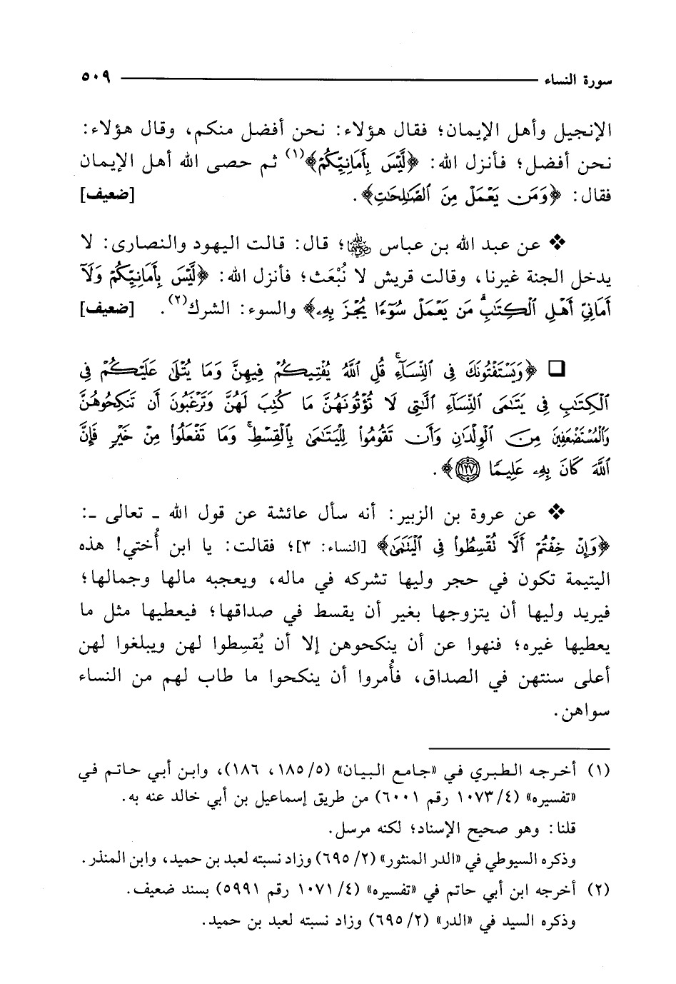 * عن عروة بن الزبير: أنه سأل عائشة عن قول الله -تعالى-: {وَإِنْ خِفْتُمْ أَلَّا تُقْسِطُوا فِي الْيَتَامَى} [النساء: 3]؛ فقالت: يا ابن أُختي! هذه اليتيمة تكون في حجر وليها تشركه في ماله، ويعجبه مالها وجمالها؛ فيريد وليها أن يتزوجها بغير أن يقسط في صداقها؛ فيعطيها مثل ما يعطيها غيره؛ فنهوا عن أن ينكحوهن إلا أن يُقسِطوا لهن ويبلغوا لهن أعلى سنتهن في الصداق، فأُمروا أن ينكحوا ما طاب لهم من النساء سواهن.