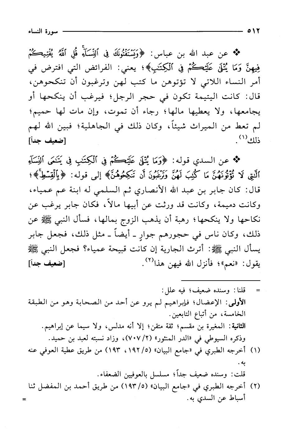 * عن السدي قوله: {وَمَا يُتْلَى عَلَيْكُمْ فِي الْكِتَابِ فِي يَتَامَى النِّسَاءِ اللَّاتِي لَا تُؤْتُونَهُنَّ مَا كُتِبَ لَهُنَّ وَتَرْغَبُونَ أَنْ تَنْكِحُوهُنَّ} إلى قوله: {بِالْقِسْطِ}؛ قال: كان جابر بن عبد الله الأنصاري ثم السلمي له ابنة عم عمياء، وكانت دميمة، وكانت قد ورثت عن أبيها مالاً، فكان جابر يرغب عن نكاحها ولا ينكحها؛ رهبة أن يذهب الزوج بمالها، فسأل النبي - صلى الله عليه وسلم - عن ذلك، وكان ناس في حجورهم جوارٍ -أيضاً- مثل ذلك، فجعل جابر يسأل النبي - صلى الله عليه وسلم -: أترث الجارية إن كانت قبيحة عمياء؟ فجعل النبي - صلى الله عليه وسلم - يقول: "نعم"؛ فأنزل الله فيهن هذا (¬2). [ضعيف جداً]
