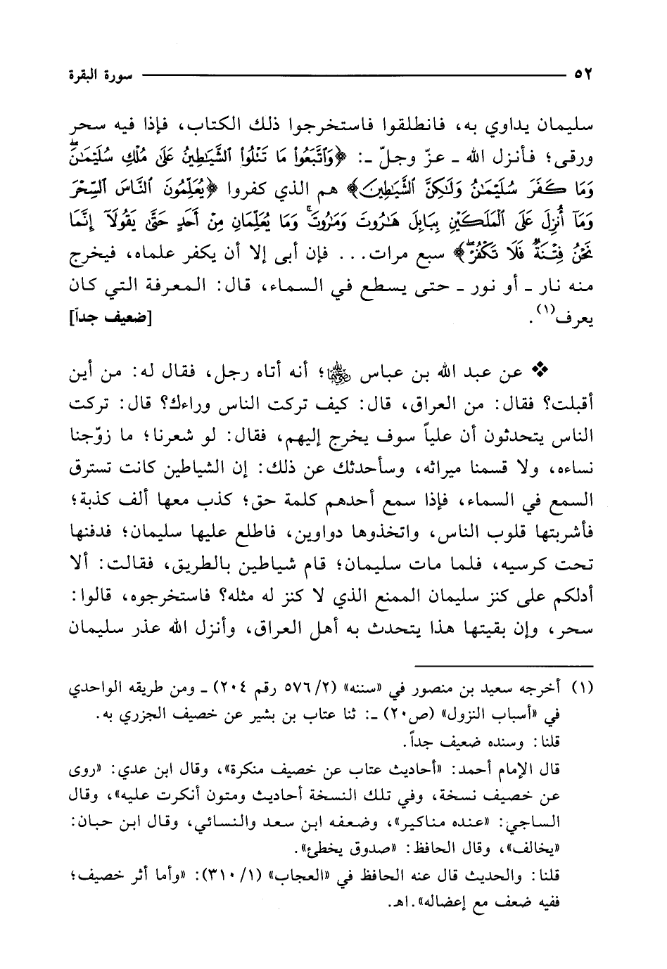سليمان يداوي به، فانطلقوا فاستخرجوا ذلك الكتاب، فإذا فيه سحر ورقى؛ فأنزل الله -عزّ وجلّ-: {وَاتَّبَعُوا مَا تَتْلُو الشَّيَاطِينُ عَلَى مُلْكِ سُلَيْمَانَ وَمَا كَفَرَ سُلَيْمَانُ وَلَكِنَّ الشَّيَاطِينَ} هم الذي كفروا {يُعَلِّمُونَ النَّاسَ السِّحْرَ وَمَا أُنْزِلَ عَلَى الْمَلَكَيْنِ بِبَابِلَ هَارُوتَ وَمَارُوتَ وَمَا يُعَلِّمَانِ مِنْ أَحَدٍ حَتَّى يَقُولَا إِنَّمَا نَحْنُ فِتْنَةٌ فَلَا تَكْفُرْ (102)} سبع مرات. . . فإن أبى إلا أن يكفر علماه، فيخرج منه نار -أو نور- حتى يسطع في السماء، قال: المعرفة التي كان يعرف (¬1). [ضعيف جداً]