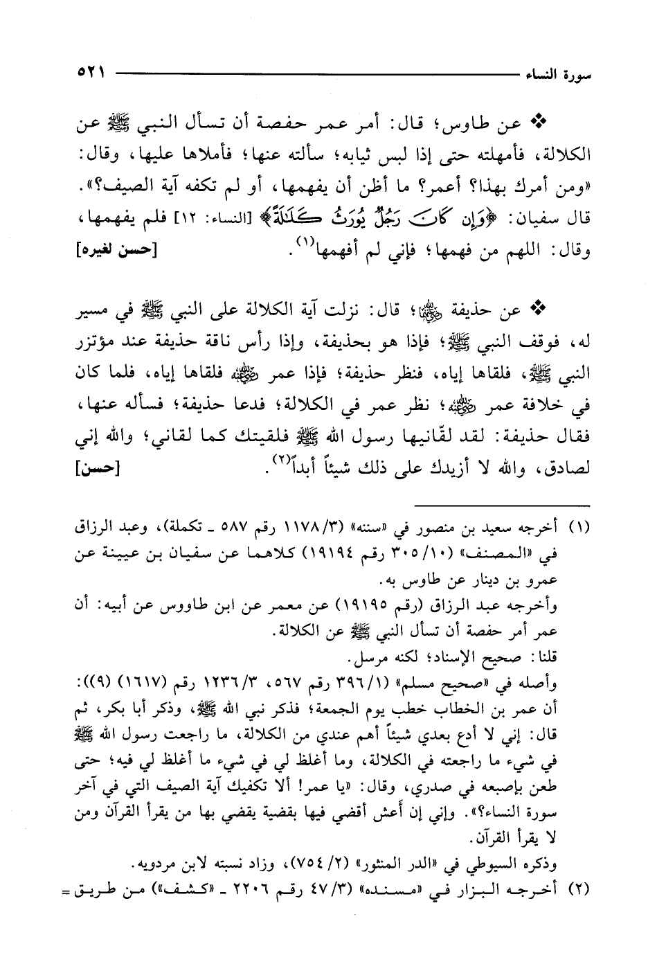 * عن حذيفة -رضي الله عنهما-؛ قال: نزلت آية الكلالة على النبي - صلى الله عليه وسلم - في مسير له، فوقف النبي - صلى الله عليه وسلم -؛ فإذا هو بحذيفة، وإذا رأس ناقة حذيفة عند مؤتزر النبي - صلى الله عليه وسلم -، فلقاها إياه، فنظر حذيفة؛ فإذا عمر -رضي الله عنه- فلقاها إياه، فلما كان في خلافة عمر -رضي الله عنه-؛ نظر عمر في الكلالة؛ فدعا حذيفة؛ فسأله عنها، فقال حذيفة: لقد لقّانيها رسول الله - صلى الله عليه وسلم - فلقيتك كما لقاني؛ والله إني لصادق، والله لا أزيدك على ذلك شيئاً أبداً (¬2). [حسن]