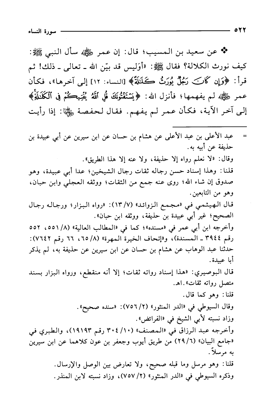 * عن سعيد بن المسيب؛ قال: إن عمر -رضي الله عنه- سأل النبي - صلى الله عليه وسلم -: كيف نورث الكلالة؟ فقال - صلى الله عليه وسلم -: "أوَليس قد بيّن الله -تعالى- ذلك! ثم قرأ: {وَإِنْ كَانَ رَجُلٌ يُورَثُ كَلَالَةً} [النساء: 12] إلى آخرها"، فكأن عمر -رضي الله عنه- لم يفهمها؛ فأنزل الله: {يَسْتَفْتُونَكَ قُلِ اللَّهُ يُفْتِيكُمْ فِي الْكَلَالَةِ} إلى آخر الآية، فكأن عمر لم يفهم. فقال لحفصة -رضي الله عنها-: إذا رأيت