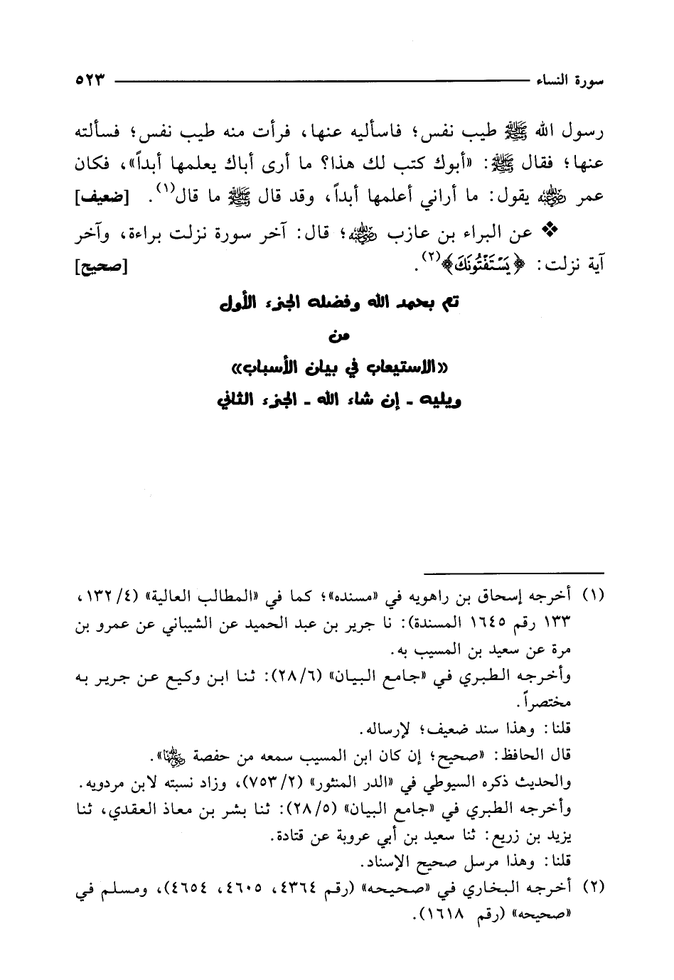 * عن البراء بن عازب -رضي الله عنه-؛ قال: آخر سورة نزلت براءة، وآخر آية نزلت: {يَسْتَفْتُونَكَ} (¬2). [صحيح]