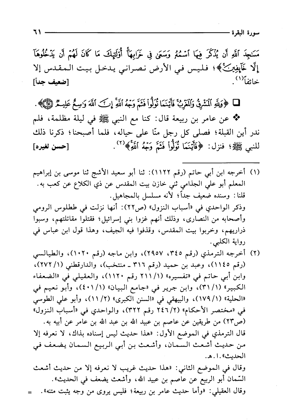 (¬2) أخرجه الترمذي (رقم 345، 2957)، وابن ماجه (رقم 1020)، والطيالسي (رقم 1145)، وعبد بن حميد (رقم 316 - منتخب)، والدارقطني (1/ 272)، وابن أبي حاتم في "تفسيره" (1/ 211 رقم 1120)، والعقيلي في "الضعفاء الكبير" (1/ 31)، وابن جرير في "جامع البيان" (1/ 401)، وأبو نعيم في "الحلية" (1/ 179)، والبيهقي في "السنن الكبرى" (2/ 11)، وأبو علي الطوسي في "مختصر الأحكام" (2/ 246 رقم 322)، والواحدي في "أسباب النزول" (ص 23) من طريقين عن عاصم بن عبيد الله بن عبد الله بن عامر عن أبيه به.