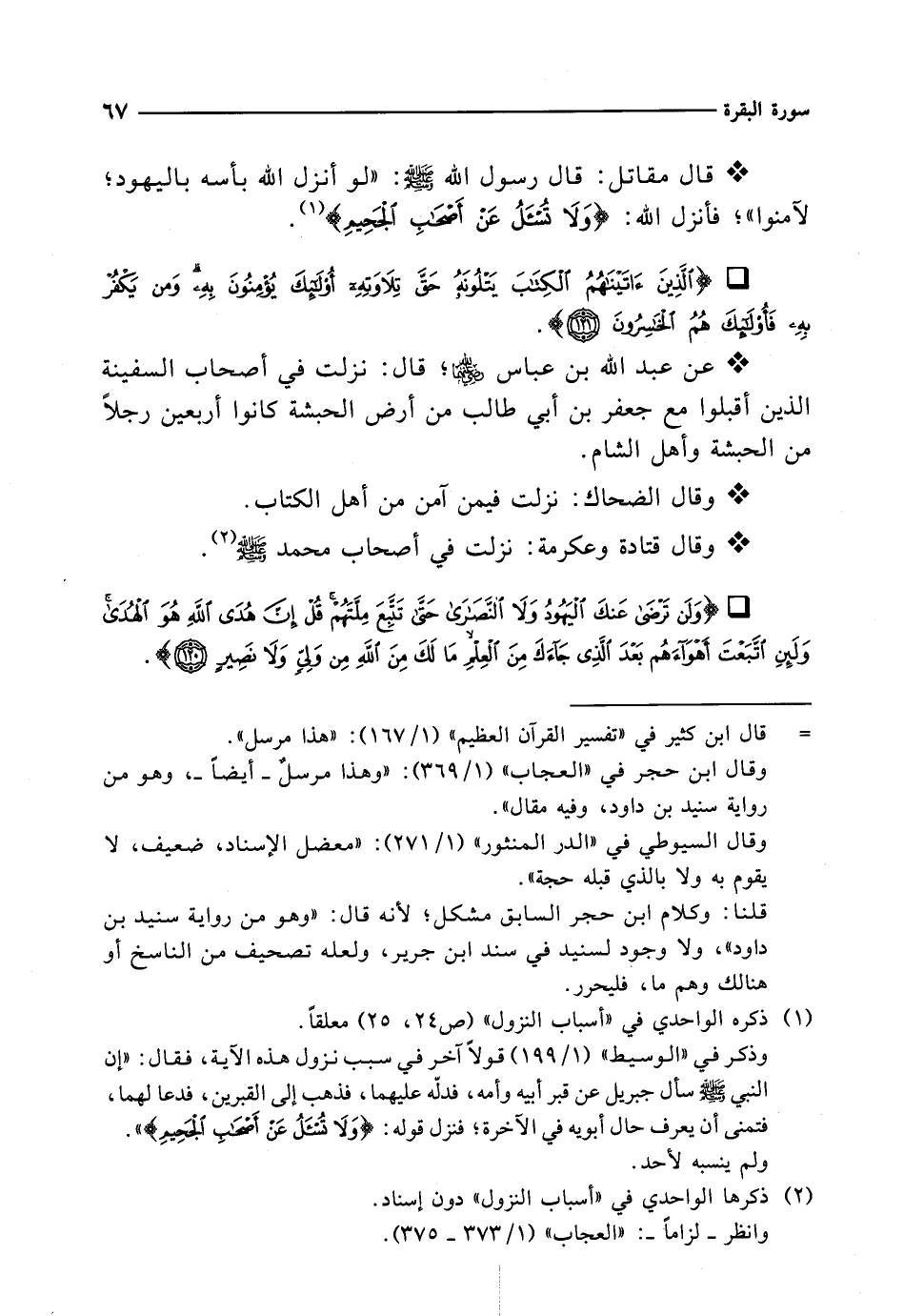 وذكر في "الوسيط" (1/ 199) قولاً آخر في سبب نزول هذه الآية، فقال: "إن النبي - صلى الله عليه وسلم - سأل جبريل عن قبر أبيه وأمه، فدلّه عليهما، فذهب إلى القبرين، فدعا لهما، فتمنى أن يعرف حال أبويه في الآخرة؛ فنزل قوله: {وَلَا تُسْأَلُ عَنْ أَصْحَابِ الْجَحِيمِ} ".