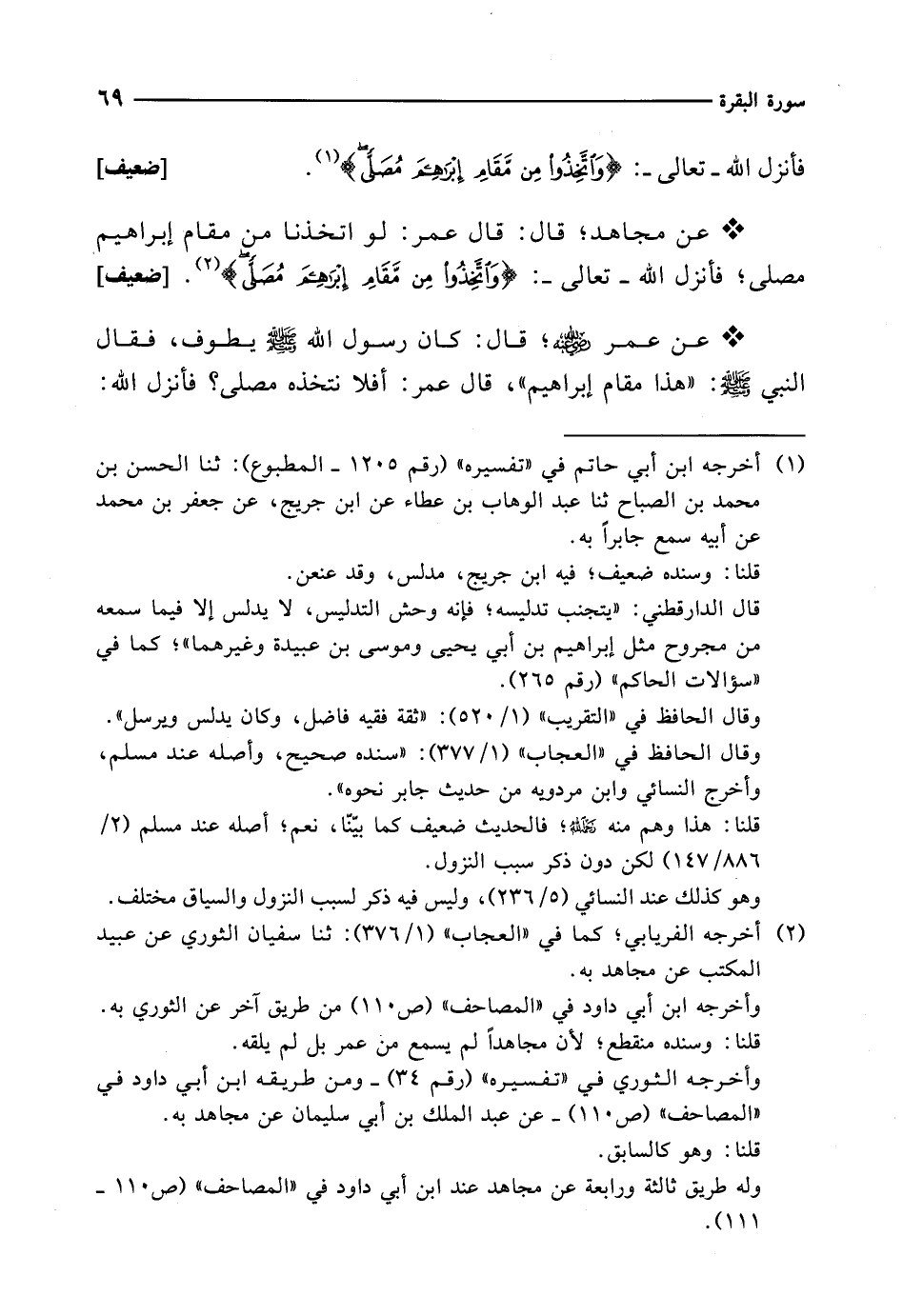 فأنزل الله -تعالى-: {وَاتَّخِذُوا مِنْ مَقَامِ إِبْرَاهِيمَ مُصَلًّى} (¬1). [ضعيف]