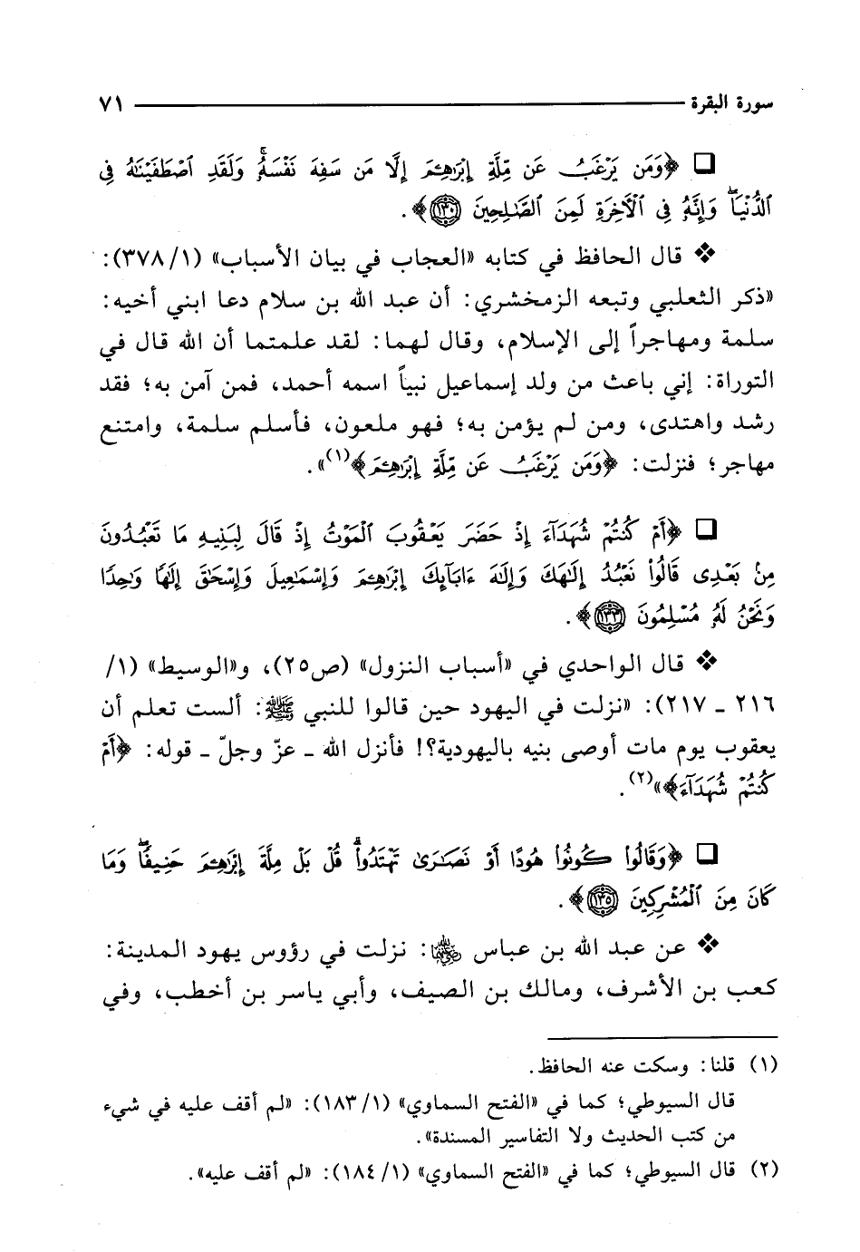 * قال الحافظ في كتابه "العجاب في بيان الأسباب" (1/ 378): "ذكر الثعلبي وتبعه الزمخشري: أن عبد الله بن سلام دعا ابني أخيه: سلمة ومهاجراً إلى الإسلام، وقال لهما: لقد علمتما أن الله قال في التوراة: إني باعث من ولد إسماعيل نبياً اسمه أحمد، فمن آمن به؛ فقد رشد واهتدى، ومن لم يؤمن به؛ فهو ملعون، فأسلم سلمة، وامتنع مهاجر؛ فنزلت: {وَمَنْ يَرْغَبُ عَنْ مِلَّةِ إِبْرَاهِيمَ} (¬1) ".