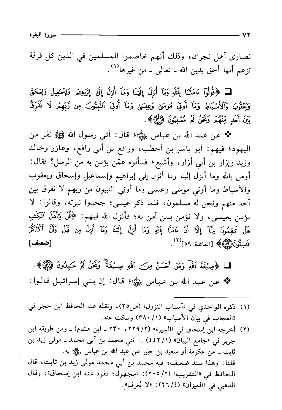 * عن عبد الله بن عباس -رضي الله عنهما-؛ قال: أتى رسول الله - صلى الله عليه وسلم - نفر من اليهود؛ فيهم: أبو ياسر بن أخطب، ورافع بن أبي رافع، وعازر وخالد وزيد وإزار بن أبي أزار، وأشيع؛ فسألوه عمّن يؤمن به من الرسل؟ فقال: أومن بالله وما أنزل إلينا وما أنزل إلى إبراهيم وإسماعيل وإسحاق ويعقوب والأسباط وما أوتي موسى وعيسى وما أوتي النبيون من ربهم لا نفرق بين أحد منهم ونحن له مسلمون، فلما ذكر عيسى؛ جحدوا نبوته، وقالوا: لا نؤمن بعيسى، ولا نؤمن بمن آمن به؛ فأنزل الله فيهم: {قُلْ يَاأَهْلَ الْكِتَابِ هَلْ تَنْقِمُونَ مِنَّا إِلَّا أَنْ آمَنَّا بِاللَّهِ وَمَا أُنْزِلَ إِلَيْنَا وَمَا أُنْزِلَ مِنْ قَبْلُ وَأَنَّ أَكْثَرَكُمْ فَاسِقُونَ (59)} [المائدة: 59] (¬2). [ضعيف]