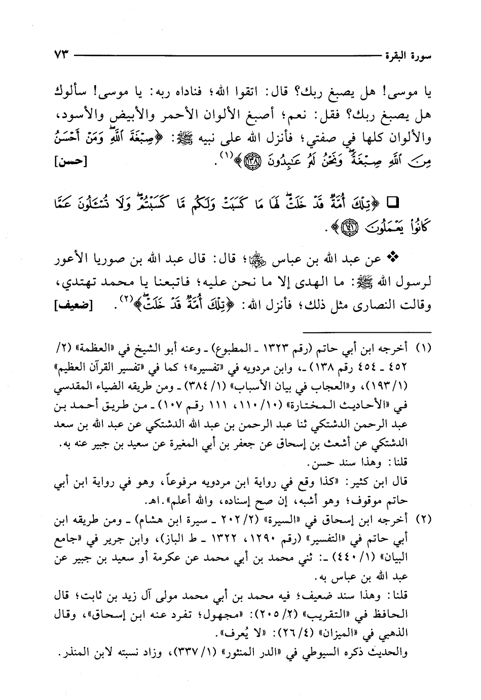 * عن عبد الله بن عباس -رضي الله عنهما-؛ قال: قال عبد الله بن صوريا الأعور لرسول الله - صلى الله عليه وسلم -: ما الهدى إلا ما نحن عليه؛ فاتبعنا يا محمد تهتدي، وقالت النصارى مثل ذلك؛ فأنزل الله: {تِلْكَ أُمَّةٌ قَدْ خَلَتْ} (¬2). [ضعيف]