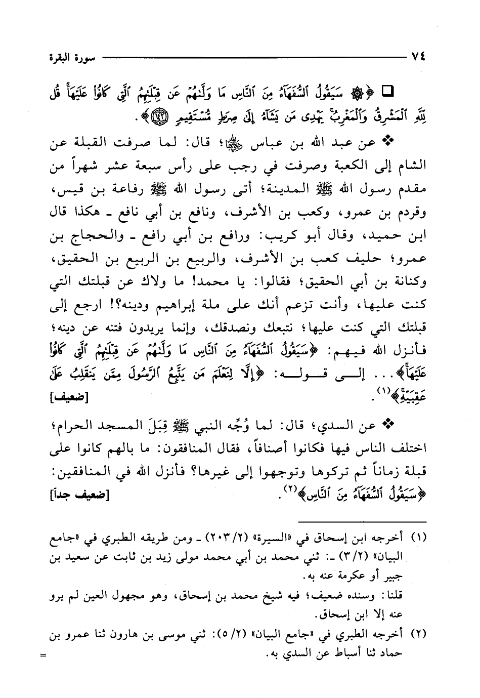 * عن السدي؛ قال: لما وُجِّه النبي - صلى الله عليه وسلم - قِبَلَ المسجد الحرام؛ اختلف الناس فيها فكانوا أصنافاً، فقال المنافقون: ما بالهم كانوا على قبلة زماناً ثم تركوها وتوجهوا إلى غيرها؟ فأنزل الله في المنافقين: {سَيَقُولُ السُّفَهَاءُ مِنَ النَّاسِ} (¬2). [ضعيف جداً]