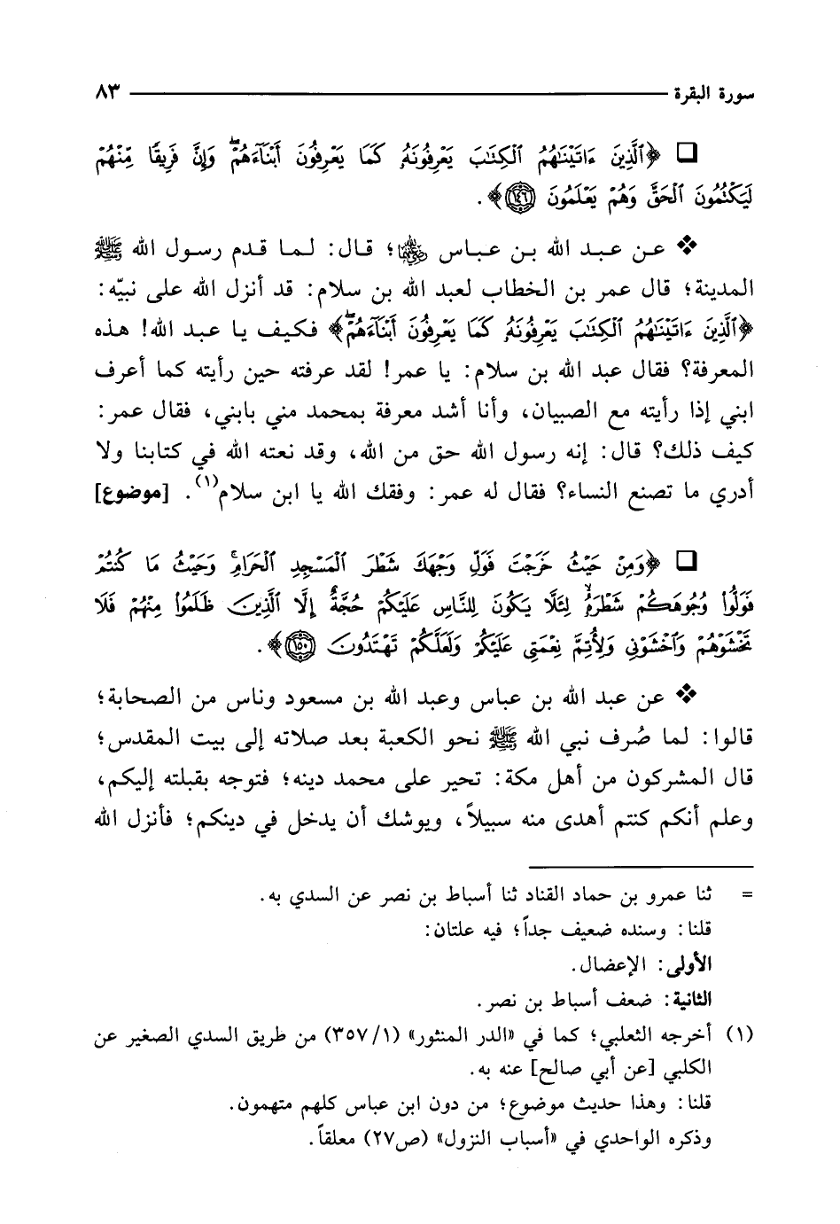 * عن عبد الله بن عباس -رضي الله عنهما-؛ قال: لما قدم رسول الله - صلى الله عليه وسلم - المدينة؛ قال عمر بن الخطاب لعبد الله بن سلام: قد أنزل الله على نبيّه: {الَّذِينَ آتَيْنَاهُمُ الْكِتَابَ يَعْرِفُونَهُ كَمَا يَعْرِفُونَ أَبْنَاءَهُمْ} فكيف يا عبد الله! هذه المعرفة؟ فقال عبد الله بن سلام: يا عمر! لقد عرفته حين رأيته كما أعرف ابني إذا رأيته مع الصبيان، وأنا أشد معرفة بمحمد مني بابني، فقال عمر: كيف ذلك؟ قال: إنه رسول الله حق من الله، وقد نعته الله في كتابنا ولا أدري ما تصنع النساء؟ فقال له عمر: وفقك الله يا ابن سلام (¬1). [موضوع]