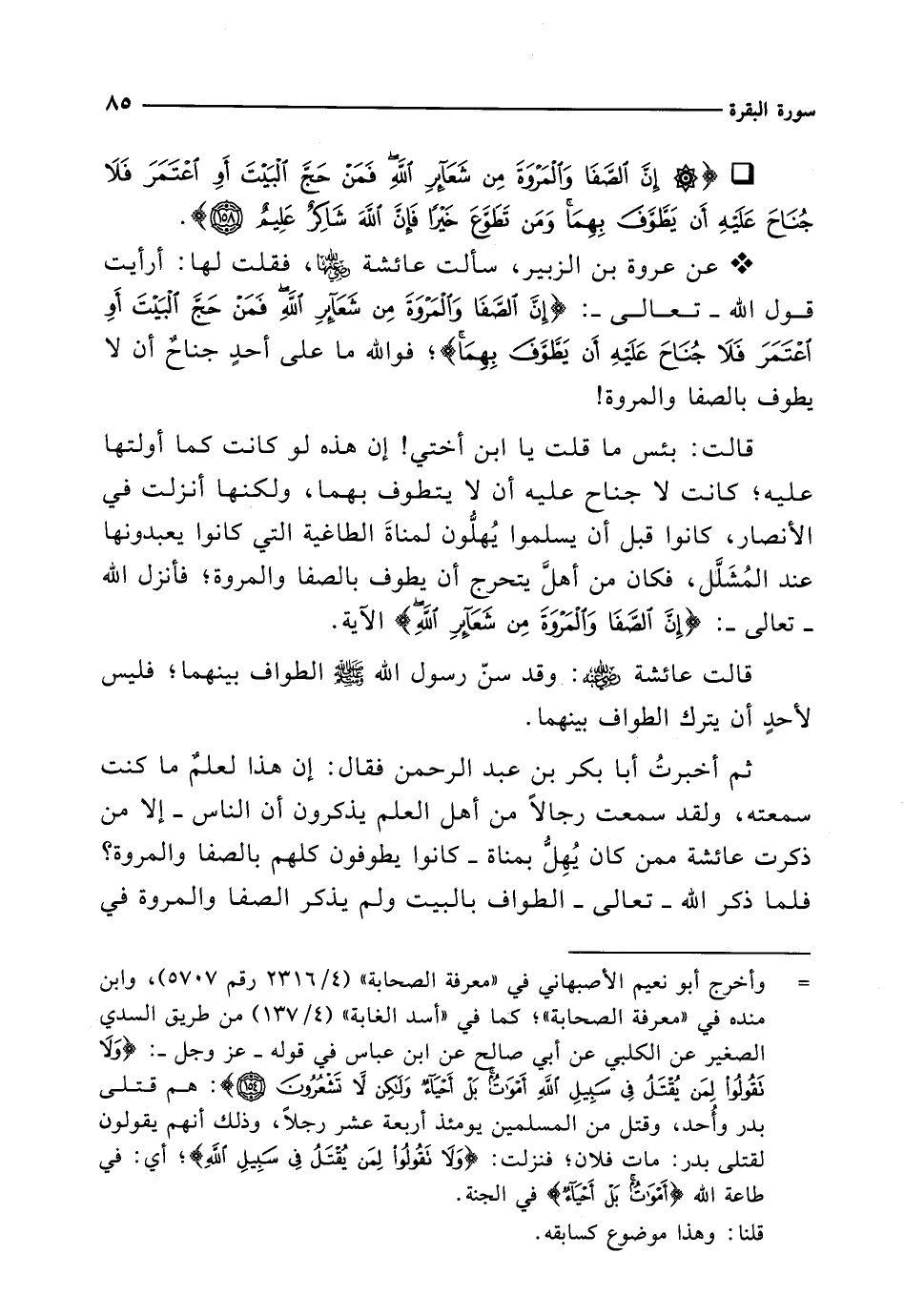 * عن عروة بن الزبير، سألت عائشة -رضي الله عنها-، فقلت لها: أرأيت قول الله -تعالى-: {إِنَّ الصَّفَا وَالْمَرْوَةَ مِنْ شَعَائِرِ اللَّهِ فَمَنْ حَجَّ الْبَيْتَ أَوِ اعْتَمَرَ فَلَا جُنَاحَ عَلَيْهِ أَنْ يَطَّوَّفَ بِهِمَا}؛ فوالله ما على أحدٍ جناحٌ أن لا يطوف بالصفا والمروة!