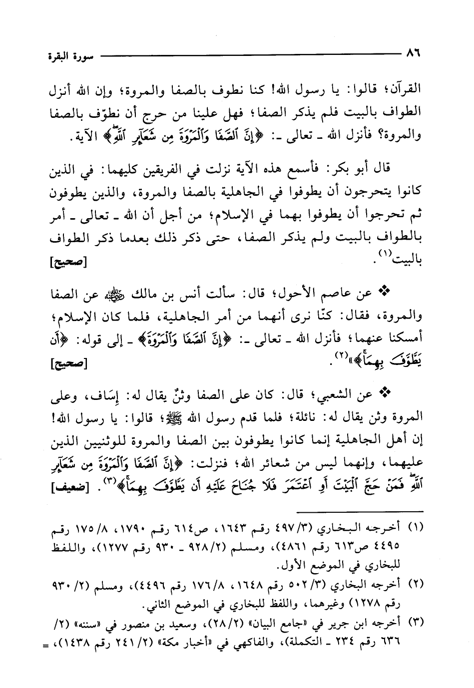 * عن الشعبي؛ قال: كان على الصفا وثنٌ يقال له: إِسَاف، وعلى المروة وثن يقال له: نائلة؛ فلما قدم رسول الله - صلى الله عليه وسلم -؛ قالوا: يا رسول الله! إن أهل الجاهلية إنما كانوا يطوفون بين الصفا والمروة للوثنيين الذين عليهما، وإنهما ليس من شعائر الله؛ فنزلت: {إِنَّ الصَّفَا وَالْمَرْوَةَ مِنْ شَعَائِرِ اللَّهِ فَمَنْ حَجَّ الْبَيْتَ أَوِ اعْتَمَرَ فَلَا جُنَاحَ عَلَيْهِ أَنْ يَطَّوَّفَ بِهِمَا} (¬3). [ضعيف]