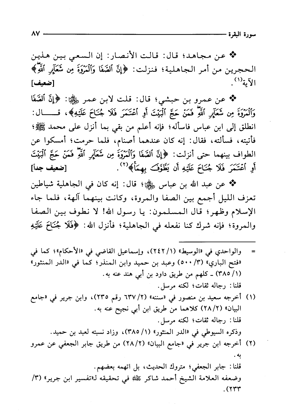 * عن عمرو بن حبشي؛ قال: قلت لابن عمر -رضي الله عنهما-: {إِنَّ الصَّفَا وَالْمَرْوَةَ مِنْ شَعَائِرِ اللَّهِ فَمَنْ حَجَّ الْبَيْتَ أَوِ اعْتَمَرَ فَلَا جُنَاحَ عَلَيْهِ}، قال: انطلق إلى ابن عباس فاسأله؛ فإنه أعلم من بقي بما أنزل على محمد - صلى الله عليه وسلم -؛ فأتيته، فسألته، فقال: إنه كان عندهما أصنام، فلما حرمت؛ أمسكوا عن الطواف بينهما حتى أنزلت: {إِنَّ الصَّفَا وَالْمَرْوَةَ مِنْ شَعَائِرِ اللَّهِ فَمَنْ حَجَّ الْبَيْتَ أَوِ اعْتَمَرَ فَلَا جُنَاحَ عَلَيْهِ أَنْ يَطَّوَّفَ بِهِمَا} (¬2). [ضعيف جداً]