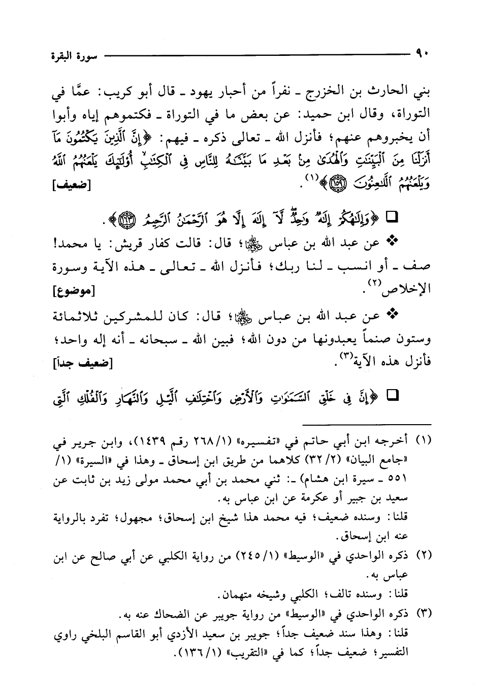 قلنا: وهذا سند ضعيف جداً؛ جويبر بن سعيد الأزدي أبو القاسم البلخي راوي التفسير؛ ضعيف جداً؛ كما في "التقريب" (1/ 136).