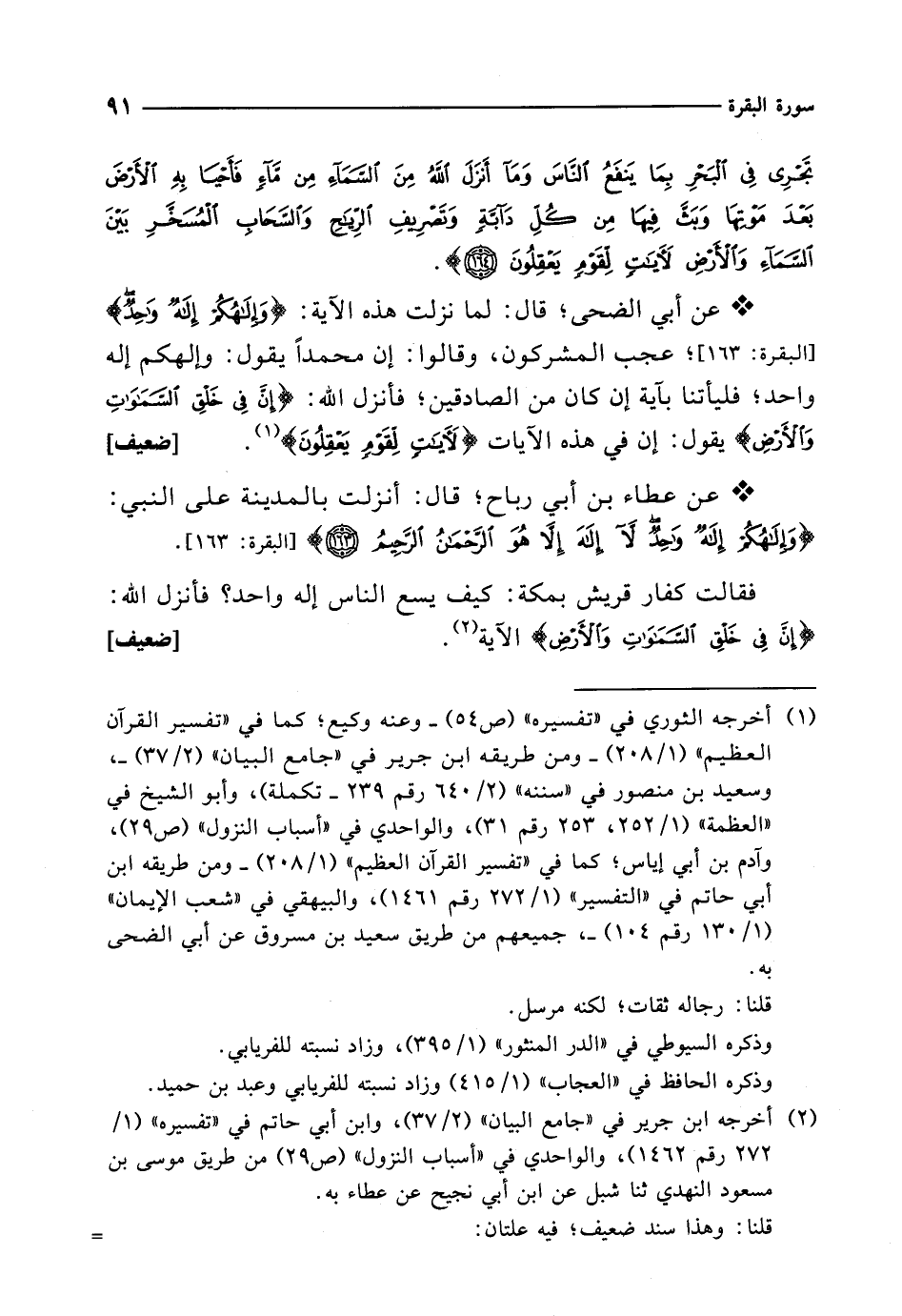 (¬1) أخرجه الثوري في "تفسيره" (ص 54) -وعنه وكيع؛ كما في "تفسير القرآن العظيم" (1/ 208) -ومن طريقه ابن جرير في "جامع البيان" (2/ 37) -، وسعيد بن منصور في "سننه" (2/ 640 رقم 239 - تكملة)، وأبو الشيخ في "العظمة" (1/ 252، 253 رقم 31)، والواحدي في "أسباب النزول" (ص 29)، وآدم بن أبي إيالس؛ كما في "تفسير القرآن العظيم" (1/ 208) -ومن طريقه ابن أبي حاتم في "التفسير" (1/ 272 رقم 1461)، والبيهقي في "شعب الإِيمان" (1/ 130 رقم 104) -، جميعهم من طريق سعيد بن مسروق عن أبي الضحى به.