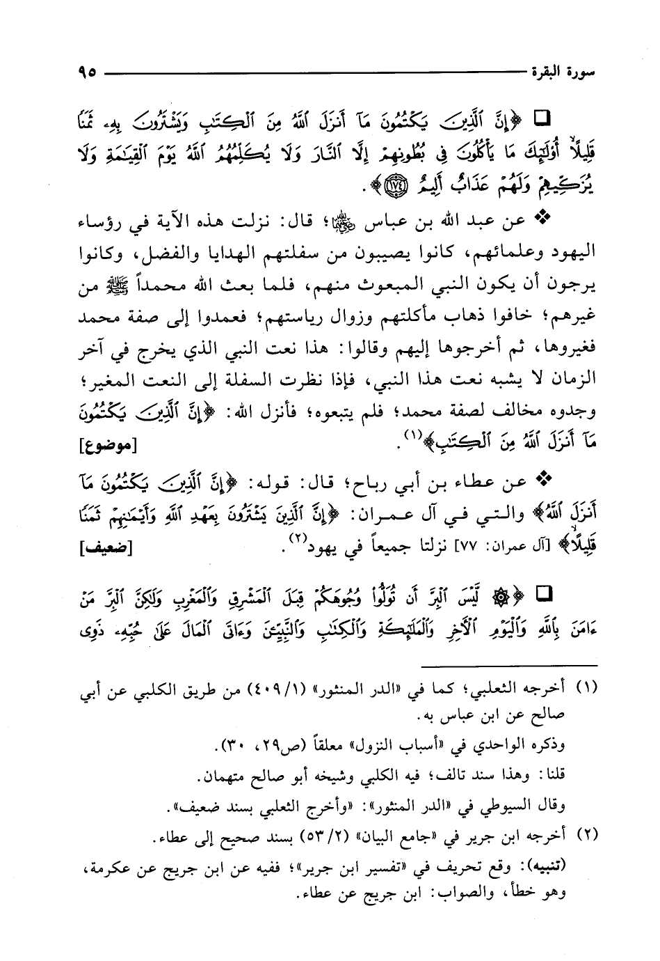 * عن عبد الله بن عباس -رضي الله عنهما-؛ قال: نزلت هذه الآية في رؤساء اليهود وعلمائهم، كانوا يصيبون من سفلتهم الهدايا والفضل، وكانوا يرجون أن يكون النبي المبعوث منهم، فلما بعث الله محمداً - صلى الله عليه وسلم - من غيرهم؛ خافوا ذهاب مأكلتهم وزوال رياستهم؛ فعمدوا إلى صفة محمد فغيروها، ثم أخرجوها إليهم وقالوا: هذا نعت النبي الذي يخرج في آخر الزمان لا يشبه نعت هذا النبي، فإذا نظرت السفلة إلى النعت المغير؛ وجدوه مخالف لصفة محمد؛ فلم يتبعوه؛ فأنزل الله: {إِنَّ الَّذِينَ يَكْتُمُونَ مَا أَنْزَلَ اللَّهُ مِنَ الْكِتَابِ} (¬1). [موضوع]