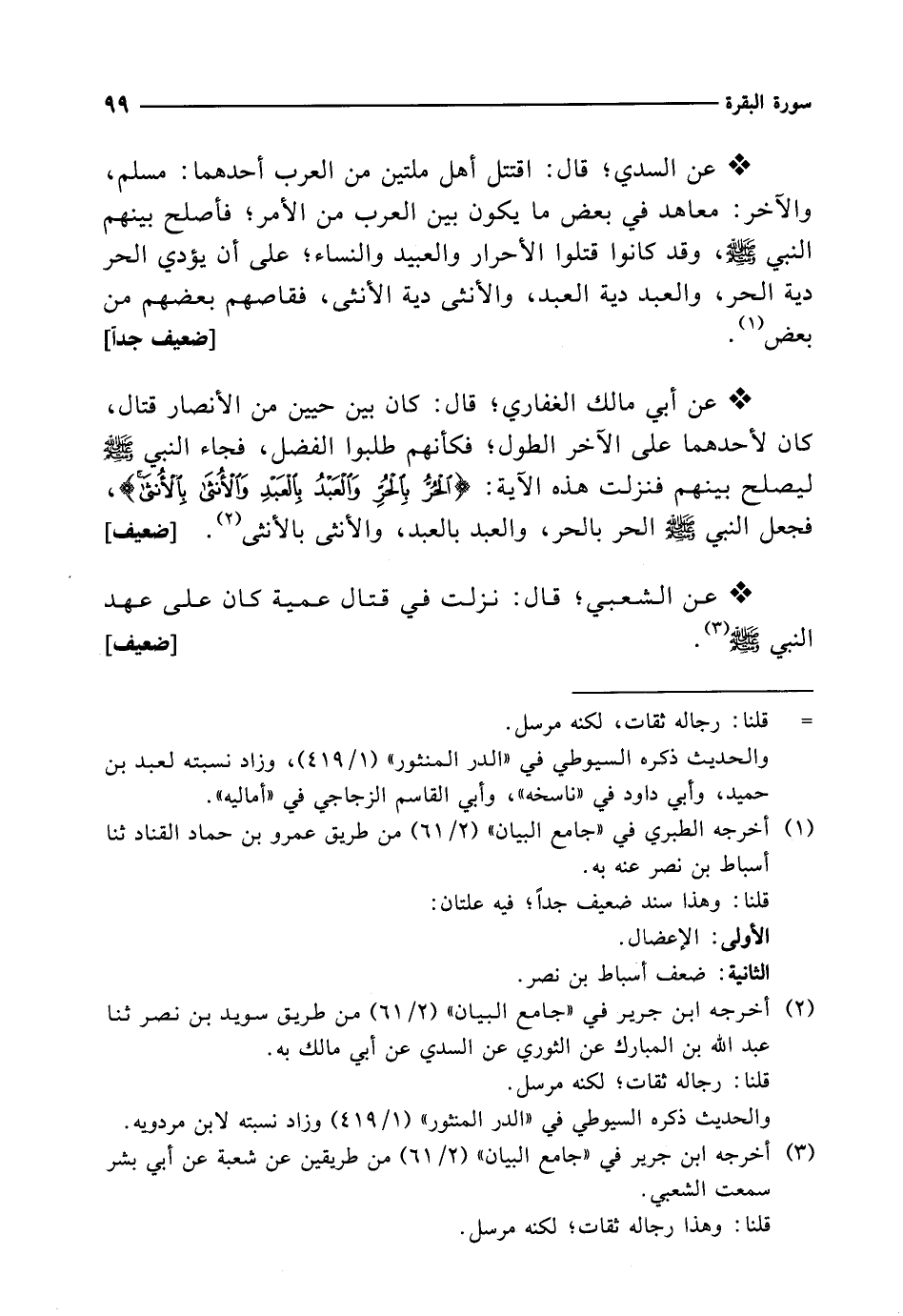 * عن السدي؛ قال: اقتتل أهل ملتين من العرب أحدهما: مسلم، والآخر: معاهد في بعض ما يكون بين العرب من الأمر؛ فأصلح بينهم النبي - صلى الله عليه وسلم -، وقد كانوا قتلوا الأحرار والعبيد والنساء؛ على أن يؤدي الحر دية الحر، والعبد دية العبد، والأنثى دية الأنثى، فقاصهم بعضهم من بعض (¬1). [ضعيف جداً]