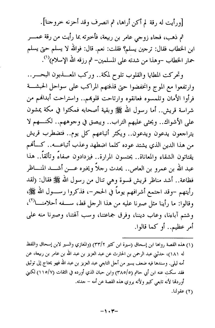 (¬1) هذه القصة رواها ابن إسحاق (سيرة ابن كثير 2/ 33) (والمغازى والسير لابن إسحاق واللفظ له 181)، حدثني عبد الرحمن بن الحارث عن عبد العزيز بن عبد الله بن عامر بن ربيعة, عن أمه ليلى. وسندها فيه ضعف يسير من أجل التابعى عبد العزيز بن عبد الله فهو يحتاج إلى توثيق فقد سكت عنه ابن أبي حاتم (5/ 385) وابن حبان الذي أورده في الثقات (7/ 115) لكننى أوردتها لأنه تابعى كبير ولأنه يروي هذه القصة عن أمه- جدته.