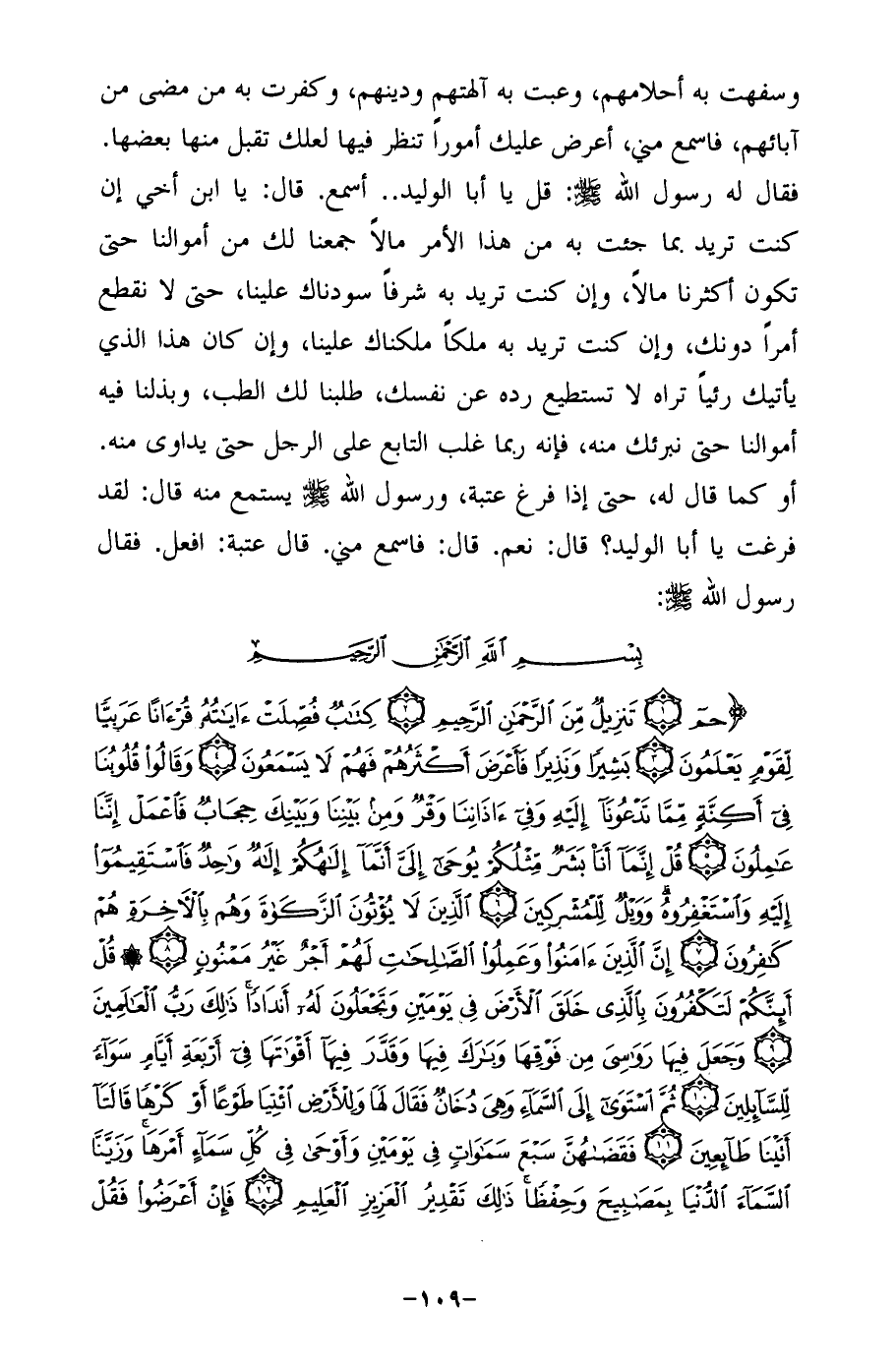 وسفهت به أحلامهم، وعبت به آلهتهم ودينهم، وكفرت به من مضى من آبائهم، فاسمع مني، أعرض عليك أمورًا تنظر فيها لعلك تقبل منها بعضها. فقال له رسول الله صلى الله عليه وسلم: قل يا أبا الوليد .. أسمع. قال: يا ابن أخي إن كنت تريد بما جئت به من هذا الأمر مالًا جمعنا لك من أموالنا حتى تكون أكثرنا مالًا، وإن كنت تريد به شرفًا سودناك علينا، حتى لا نقطع أمرًا دونك، وإن كنت تريد به ملكًا ملكناك علينا، وإن كان هذا الذي يأتيك رئيًا تراه لا تستطيع رده عن نفسك، طلبنا لك الطب، وبذلنا فيه أموالنا حتى نبرئك منه، فإنه ربما غلب التابع على الرجل حتى يداوى منه. أو كما قال له، حتى إذا فرغ عتبة، ورسول الله صلى الله عليه وسلم يستمع منه قال: لقد فرغت يا أبا الوليد؟ قال: نعم. قال: فاسمع مني. قال عتبة: افعل. فقال رسول الله صلى الله عليه وسلم: