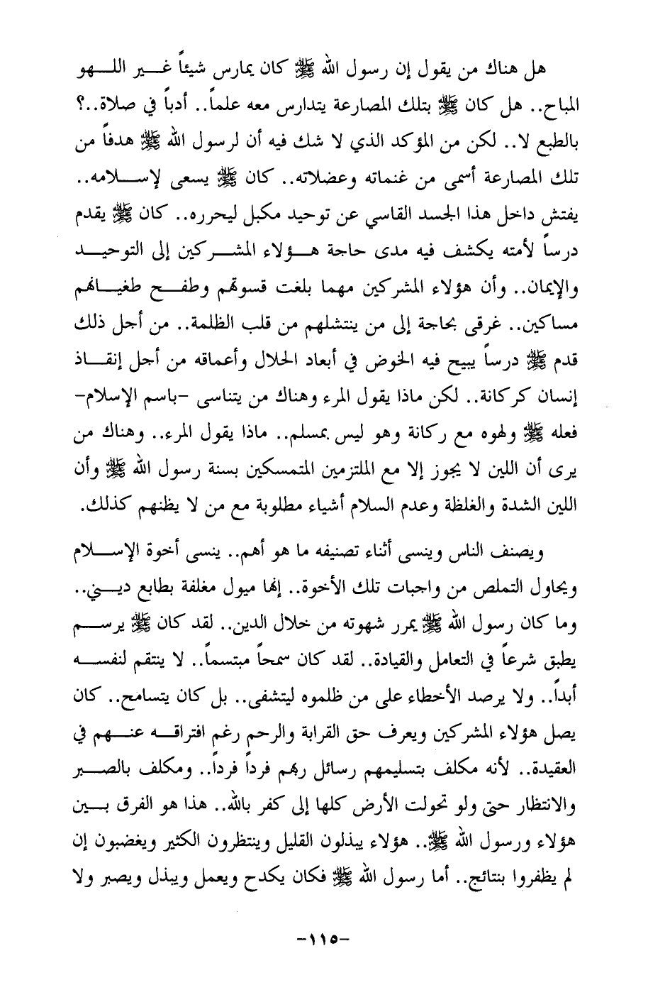ويصنف الناس وينسى أثناء تصنيفه ما هو أهم .. ينسى أخوة الإِسلام ويحاول التملص من واجبات تلك الأخوة .. إنها ميول مغلفة بطابع ديني .. وما كان رسول الله صلى الله عليه وسلم يمرر شهوته من خلال الدين .. لقد كان صلى الله عليه وسلم يرسم يطبق شرعًا في التعامل والقيادة .. لقد كان سمحًا مبتسمًا .. لا ينتقم لنفسه أبدًا .. ولا يرصد الأخطاء على من ظلموه ليتشفى .. بل كان يتسامح .. كان يصل هؤلاء المشركين ويعرف حق القرابة والرحم رغم افتراقه عنهم في العقيدة .. لأنه مكلف بتسليمهم رسائل ربهم فردًا فردًا .. ومكلف بالصبر والانتظار حتى ولو تحولت الأرض كلها إلى كفر بالله .. هذا هو الفرق بين هؤلاء ورسول الله صلى الله عليه وسلم .. هؤلاء يبذلون القليل وينتظرون الكثير ويغضبون إن لم يظفروا بنتائج .. أما رسول الله صلى الله عليه وسلم فكان يكدح ويعمل ويبذل ويصبر ولا