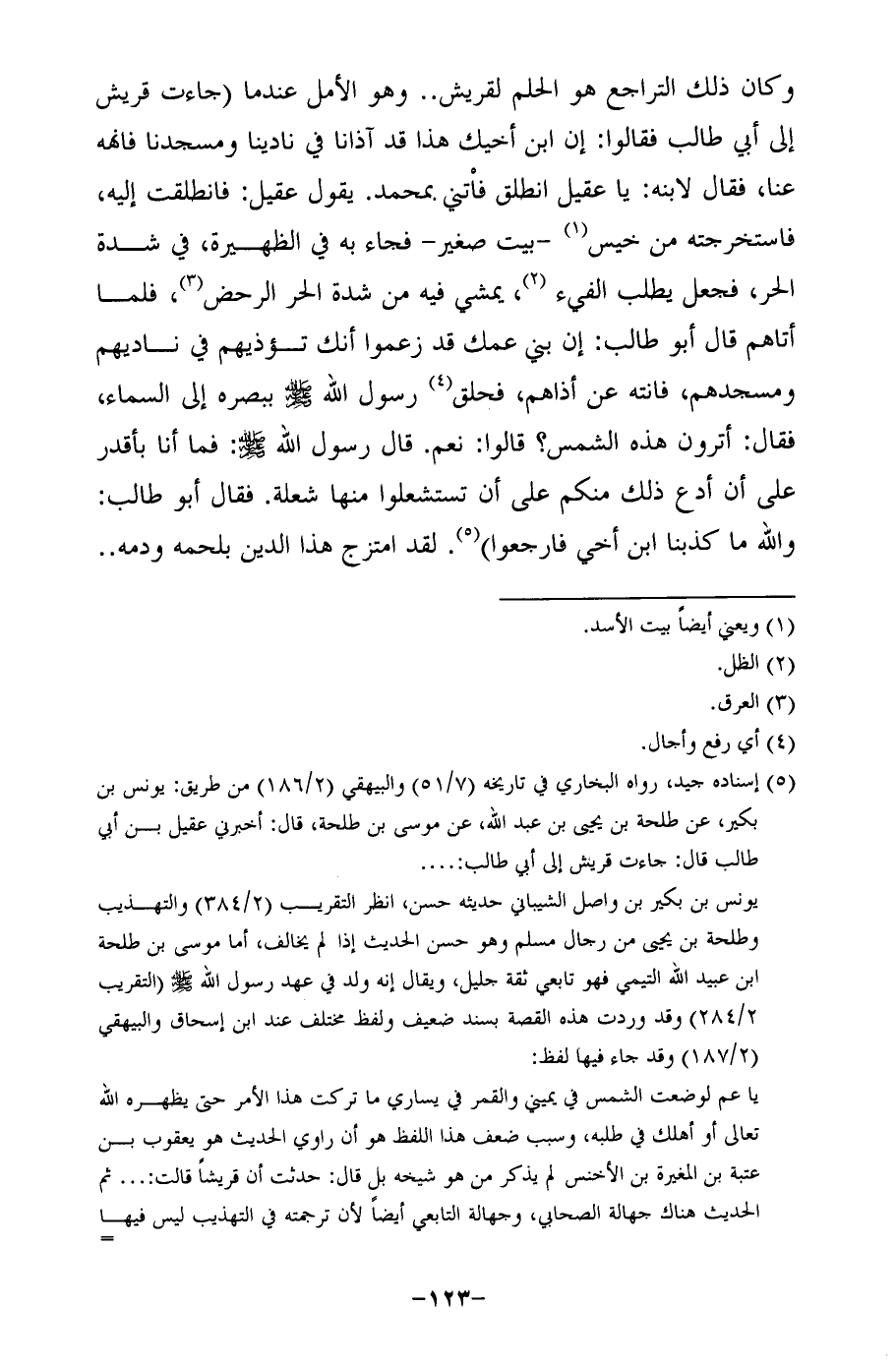 (¬5) إسناده جيد، رواه البخاري في تاريخه (7/ 51) والبيهقيُّ (2/ 186) من طريق: يونس بن بكير، عن طلحة بن يحيى بن عبد الله، عن مرسى بن طلحة، قال: أخبرني عقيل بن أبي طالب قال: جاءت قريش إلى أبى طالب: ....