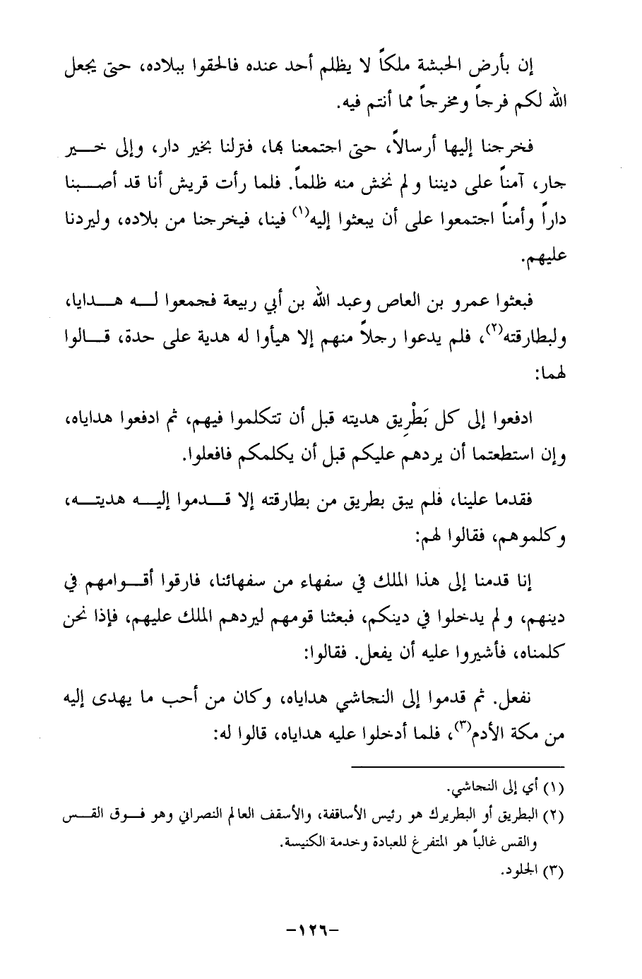 إنا قدمنا إلى هذا الملك في سفهاء من سفهائنا، فارقوا أقوامهم في دينهم، ولم يدخلوا في دينكم، فبعثنا قومهم ليردهم الملك عليهم، فإذا نحن كلمناه، فأشيروا عليه أن يفعل. فقالوا: